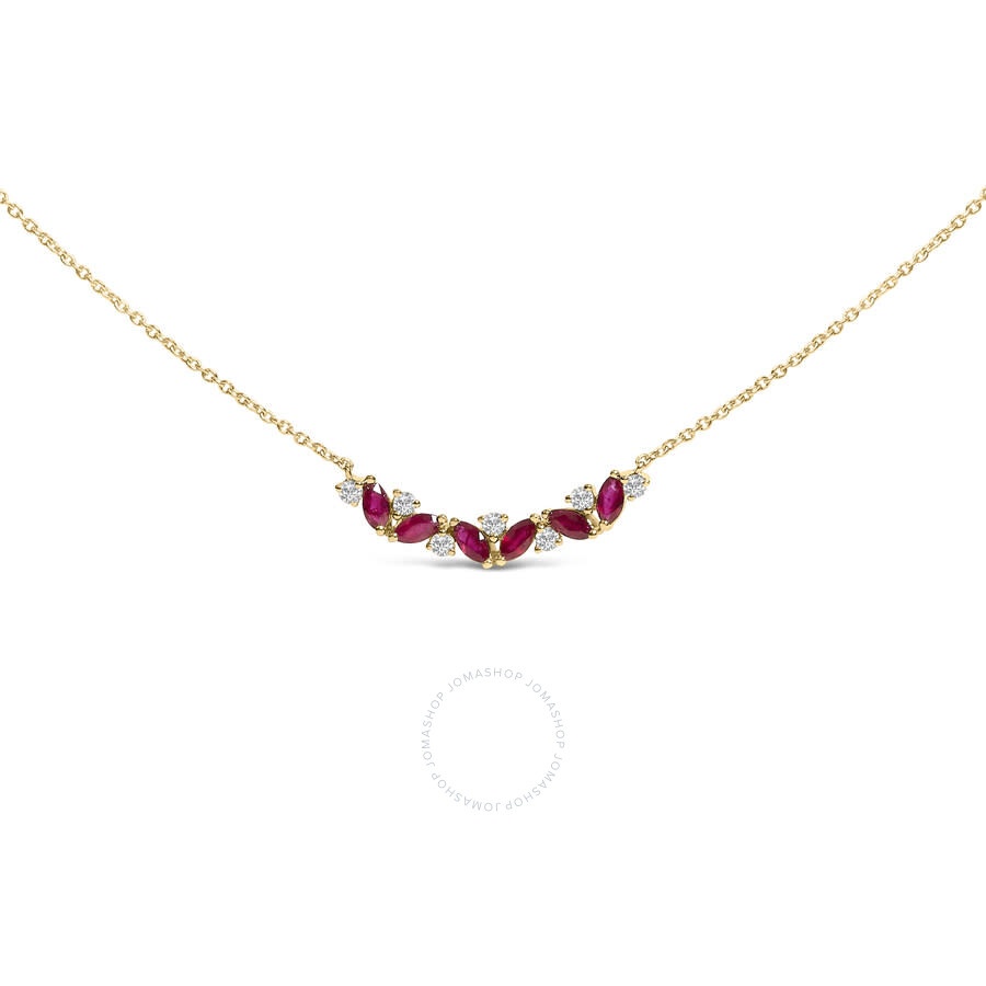 Discover elegance with each glance at this radiant 18-inch necklace, a symphony of natural brilliance and artisanal charm. Forged in the warm embrace of 14K yellow gold, its slender cable chain and secure lobster claw clasp lay the foundation for an enchanting dance of light and color. Effortlessly alternating along this golden thread are the cool sparkles of natural diamonds with I-J color and SI2-I1 clarity and the deep allure of marquise-cut red rubies, each gem prong set to catch the eye with their sumptuous hues. These oiled, natural rubies, measuring an exquisite 4x2 mm, enhance the fiery depths of each stone, making the necklace not just a piece of jewelry but an heirloom to cherish. Embrace the allure of this creation, perfect for adding a luxurious flourish to every occasion. Haus of Brilliance Ladies Necklaces. Ruby And Diamond Station Necklace series. SKU: 023232NASH. Color: Yellow. Metal Type: Gold. Metal Stamp: 14k. Metal Weight: 0.72g. Gem stone type: Ruby. Stone weight: 0.9ct. Number of stones: 13. Stone shape: Round. Stone color: Red. Necklace style: Station. Chain type: Cable. Closure type: Lobster. Haus of Brilliance 14K Yellow Gold Red Ruby and Diamond Trio Bar Line Necklace (I-J Color, SI2-I1 Clarity) - 18 inch. GENERAL Box: No Papers: No Stone Shape: Round Color: Yellow Collection Name: Ruby And Diamond Station Necklace INFORMATION Brand: Haus Of Brilliance Series: Ruby And Diamond Station Necklace Gender: Womens Model: 023232NASH DETAILS Size Info: 18 inches Necklaces: Station Chain Type: Cable Closure Type: Lobster Material : Gold Metal Stamp: 14K Metal Weight: 0.72 Stone Type: Ruby Stone Weight: 0.9 Stone Color: Red Stone Cut: Round Stone Origin: Natural Total Stones: 13 ADDITIONAL INFO Additional Info: Gemstone MM Size: Ruby: 2 x 4; Gemstone Count: 6; Diamond Total Weight: 0.147; Total Diamond Count: 7 Jomashop Sku: Y-A589F Department: Jewelry Category: Necklaces