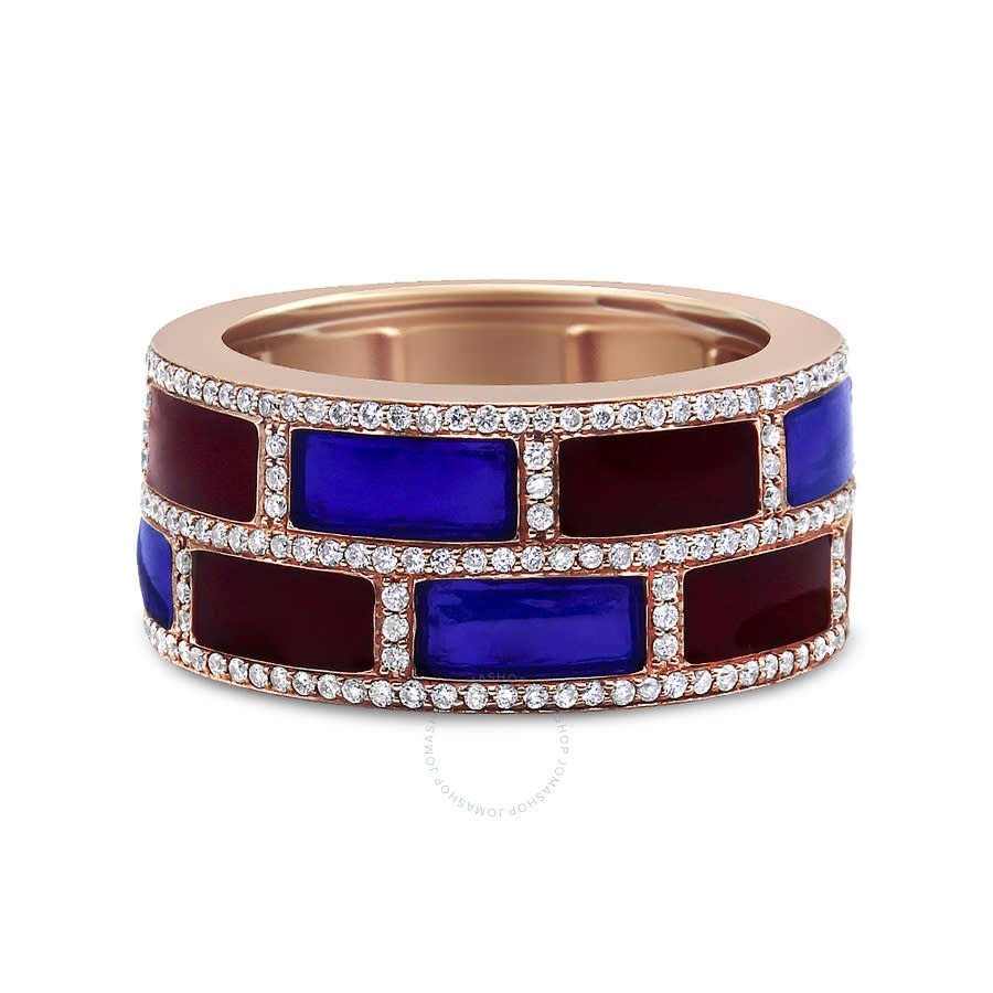 Bold, bright and beautiful! This contemporary diamond and enamel ring is hand-crafted in Thailand and is truly a one-of-a-kind treasure. This band is crafted from warm 18k rose gold featuring alternating patterns of smooth ruby red and lapis blue enamel and accented with 3 rows of 193 pave set diamonds. This band would look amazing solo or stacked with others for a bold on trend look. The ring is available in size 7 only. Up your fashion game with this vibrant band. GENERAL Stone Shape: Round Color: Pink Collection Name: Two Toned Band INFORMATION Brand: Haus Of Brilliance Series: Two Toned Band Gender: Womens Model: 019452RD01 DETAILS Ring Size: Ring Size 7 Ring Style: Fashion Material : Gold Metal Stamp: 18K Metal Weight: 9.657 Stone Type: Diamond Stone Weight: 0.51 Stone Color: F Stone Cut: Round Stone Clarity: VS1 Stone Origin: Natural Total Stones: 193 ADDITIONAL INFO Jomashop Sku: Y-173433 Department: Jewelry Category: Rings Choose a Size: Ring Size: 7