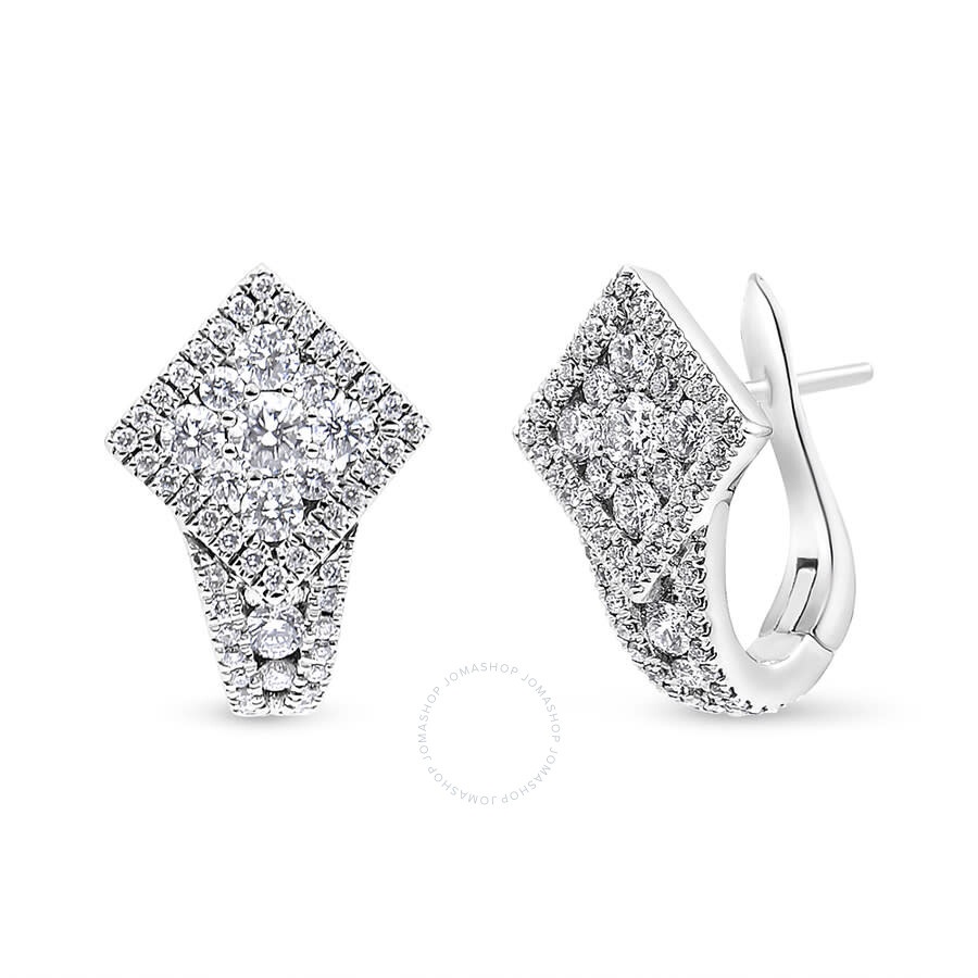 Increase her sparkle factor with these shimmering diamond huggie earrings. Crafted from cool 18K white gold, each huggie hoop earring features a rhombus shape of tightly packed round diamonds surrounded by a halo of round diamonds to give a rectangular diamond halo frame. Below, a 3-row channel of round diamonds run down into the latch back mechanism. Uniquely timeless with 1 1/10 ct. t.w. of diamonds and a bright polished shine, these earrings secure with a latch back. GENERAL Stone Shape: Round Color: White Collection Name: Hoop Earring INFORMATION Brand: Haus Of Brilliance Series: Hoop Earring Gender: Womens Model: 019447ED01 DETAILS Earrings: Hoop Material : Gold Metal Stamp: 18K Metal Weight: 5.22 Stone Type: Diamond Stone Weight: 0.2 Stone Color: F Stone Cut: Round Stone Clarity: VS1-VS2 Stone Origin: Natural Total Stones: 118 ADDITIONAL INFO Jomashop Sku: Y-173429 Department: Jewelry Category: Earrings