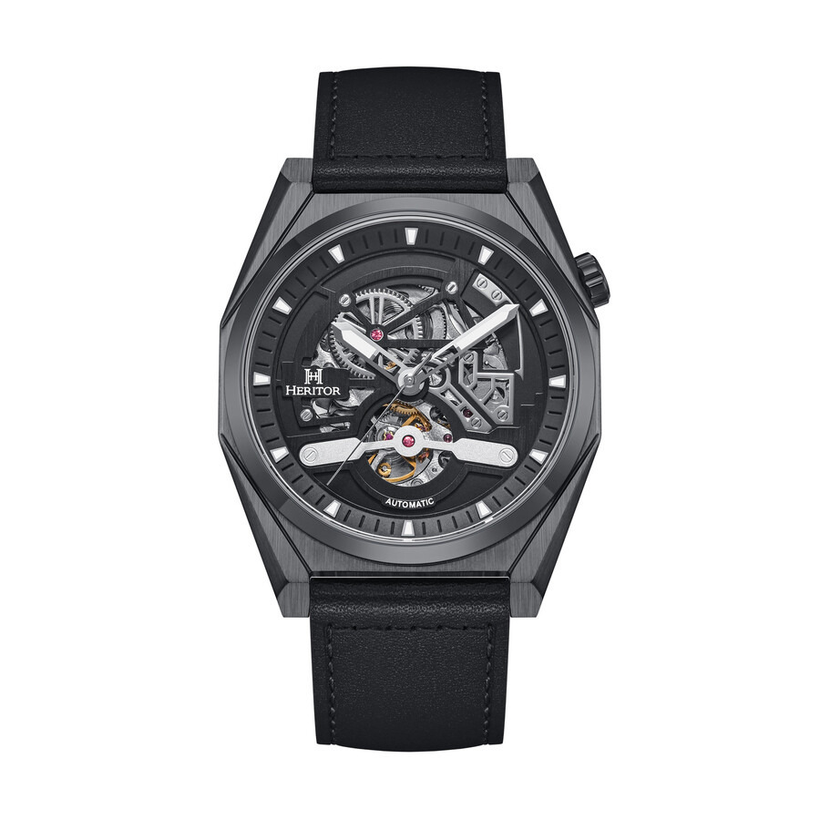 Black stainless steel case with a black genuine leather strap. Fixed black stainless steel bezel. Black dial with silver-tone hands and Arabic numeral hour markers. Minute markers around the outer rim. Dial Type: Analog. Luminescent hands and markers. Automatic movement. Pull / push crown. Tonneau case shape, case size: 43 mm, case thickness: 13 mm. Band width: 22 mm, band length: 9 inches. Buckle clasp. Water resistant at 100 meters / 330 feet. Functions: hour, minute, second. Amadeus Series. Casual watch style. Heritor Amadeus Automatic Black Dial Men's Watch HERHS3405. GENERAL Box Type: Original Box CASE Case Diameter: 43 mm Case Thickness: 13 mm Case Material: Stainless Steel Case Shape: Tonneau BAND Band Material: Genuine Leather Band Type: Strap Band Color: Black Band Length: 9 inches Band Width: 22 mm Clasp: Buckle DIAL Dial Color: Black Type: Analog Hands: Silver-tone Dial Markers: Arabic Numeral Second Markers: Minute Markers around the outer rim Luminiscence: Hands and Markers Bezel: Fixed Bezel Color: Black Bezel Material: Stainless Steel Crown: Pull / Push INFORMATION Brand: Heritor Series: Amadeus Collection Name: Amadeus Gender: Mens Model: HERHS3405 Movement: Automatic FEATURES Water Resistance: 100 meters / 330 feet Functions: Hour, Minute, Second Watch Features: Analog, Leather, Stainless Steel ADDITIONAL INFO Watch Style: Casual Warranty: With Manufacturers Guarantee UPC Code: 840148810624 Jomashop Sku: Y-A4UYP Department: Watches