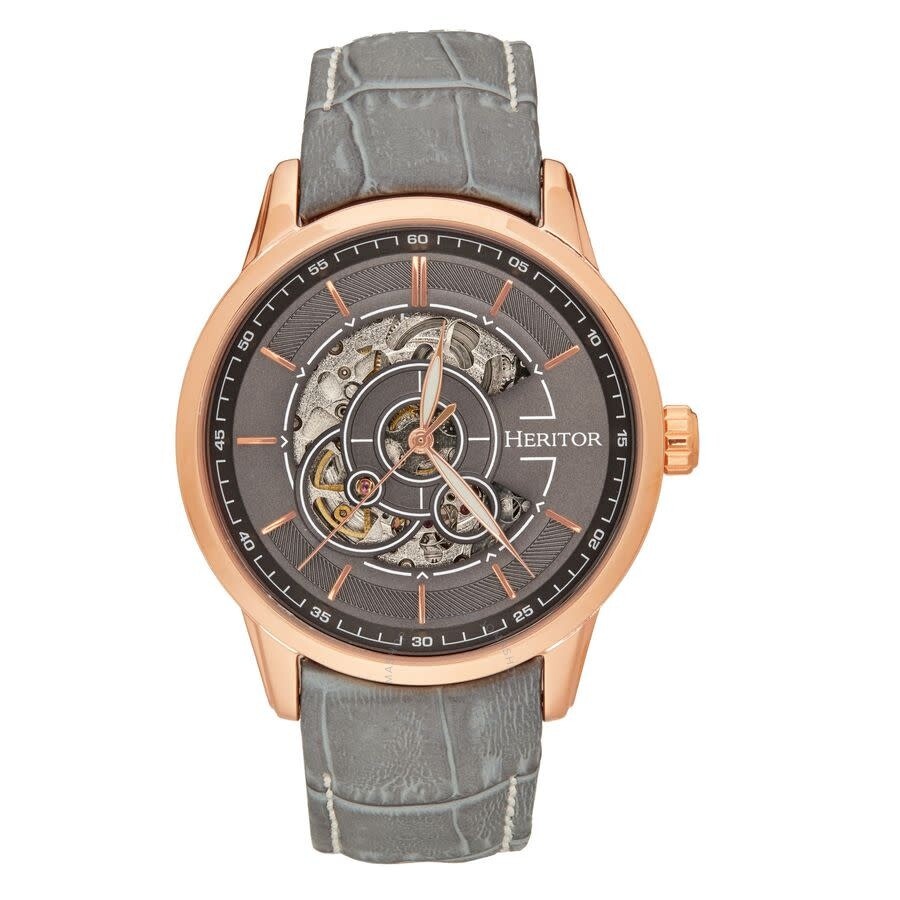 Band Color: Gray Genuine Leather; Band Width: 22mm near case; 20mm near clasp/buckle; Bezel Color: Rose Gold; Case: Rose Gold + Circle-Shaped; Case Finish: Brushed + Stainless Steel; Case Thickness: 12mm; Case Width: 44mm; 48mm with Crown; Clasp / Buckle: Strap Buckle; Dial: Gray + Analog; Hand Color: Rose Gold; Movement: Chinese + Automatic; Time Zones: Single; Water Resistance: 5 ATM. INFORMATION Brand: Heritor Series: Davies Collection Name: Davies Gender: Mens Model: HERHS2505 Movement: Automatic CASE Case Size: 44 mm Case Thickness: 12 mm Case Material: Stainless Steel Case Shape: Round Case Back: Transparent BAND Band Material: Genuine Leather Band Type: Strap Band Color: Grey Band Length: 8.5 inches Band Width: 22 mm Clasp: Buckle DIAL Dial Color: Grey Type: Analog Crystal: Scratch Resistant Mineral Hands: Rose Gold-tone Dial Markers: Index Second Markers: Minute Markers around the outer rim Luminiscence: Hands and Markers Bezel: Fixed Bezel Color: Rose Gold-tone Bezel Material: Stainless Steel Crown: Pull / Push FEATURES Water Resistance: 50 meters / 165 feet Functions: Hour, Minute, Second Watch Features: Time Zone, Stainless Steel, Leather, Gold, Analog ADDITIONAL INFO Watch Style: Casual Warranty: With Manufacturers Guarantee UPC Code: 840148807723 Jomashop Sku: Y-A2UY7 Department: Watches Category: Watches