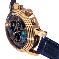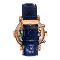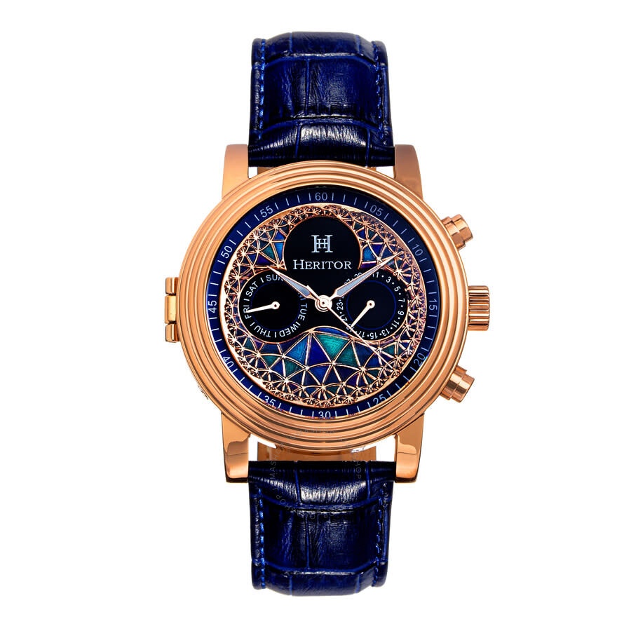 Rose gold-tone stainless steel case with a blue leather strap. Fixed rose gold-tone bezel. Multi-color dial with luminous rose gold-tone alpha-style hands. Arabic numeral minute markers (at 5 minute intervals). Minute markers around the outer rim. Dial Type: Analog. Luminescent hands. Two multi-function sub-dials displaying: day of the week and date. Automatic movement. Scratch resistant mineral crystal. Pull / push crown. Transparent case back. Round case shape. Case size: 44 mm. Case thickness: 18 mm. Band width: 22 mm. Band length: 9.5 inches. Tang clasp. Water resistant at 50 meters / 165 feet. Functions: date, day, hour, minute, second. Legacy Series. Casual watch style. Heritor Legacy Automatic Multi-Color Dial Men's Watch HERHR9705. INFORMATION Brand: Heritor Series: Legacy Collection Name: Legacy Gender: Mens Model: HERHR9705 Movement: Automatic CASE Case Size: 44 mm Case Thickness: 18 mm Case Material: Stainless Steel Case Shape: Round Case Back: Transparent BAND Band Material: Leather Band Type: Strap Band Color: Blue Band Length: 9.5 inches Band Width: 22 mm Clasp: Tang DIAL Dial Color: Multi-Color Type: Analog Crystal: Scratch Resistant Mineral Hands: Luminous Rose Gold-tone Alpha-style Dial Markers: Arabic Numeral & Index Second Markers: Arabic Numeral Minute Markers (at 5 minute intervals). Minute Markers around the outer rim Sub Dials: Two - Day of the Week and Date Luminiscence: Hands Bezel: Fixed Bezel Color: Rose Gold-tone Bezel Material: Stainless Steel Crown: Pull / Push FEATURES Water Resistance: 50 meters / 165 feet Calendar: Date display at the 3 o'clock position Functions: Date, Day, Hour, Minute, Second Watch Features: Stainless Steel, Leather, Gold, Analog ADDITIONAL INFO Watch Style: Casual Warranty: With Manufacturers Guarantee UPC Code: 840148800366 Jomashop Sku: HRTHERHR9705 Department: Watches Category: Watches