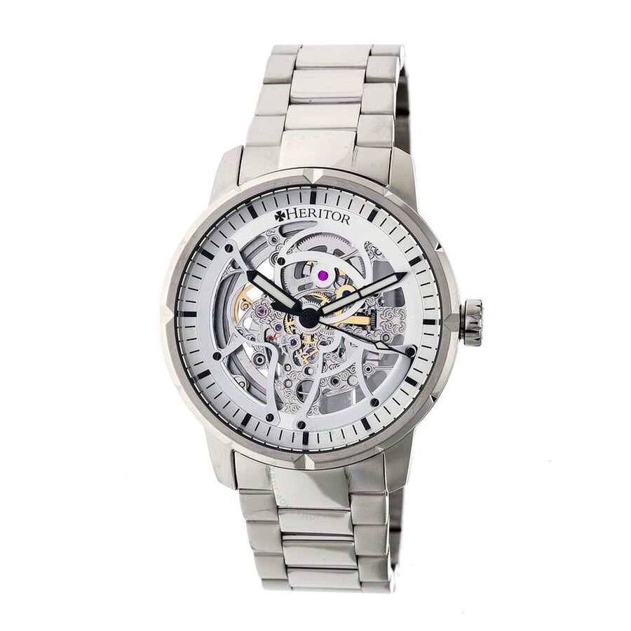 Stainless steel case with a stainless steel bracelet. Fixed stainless steel bezel. Silver (skeleton center) dial with luminous black hands and index hour markers. Minute markers around the outer rim. Dial Type: Analog. Luminescent hands. Automatic movement. Scratch resistant sapphire-coated mineral crystal. Pull / push crown. Transparent case back. Round case shape. Case size: 44 mm. Case thickness: 13 mm. Band width: 22 mm. Fold over clasp with a safety release. Water resistant at 50 meters / 165 feet. Functions: hour, minute, second. Ryder Series. Casual watch style. Heritor Ryder Automatic Silver Skeleton Dial Men's Watch HR4607. GENERAL Box Type: Original Box CASE Case Diameter: 44 mm Case Thickness: 13 mm Case Material: Stainless Steel Case Shape: Round Case Back: Transparent BAND Band Material: Stainless Steel Band Type: Bracelet Band Color: Silver-tone Band Width: 22 mm Clasp: Fold Over with Safety Release DIAL Dial Color: Silver (Skeleton Center) Type: Analog Crystal: Sapphire-Coated Mineral Hands: Luminous Black Dial Markers: Index Second Markers: Minute Markers around the outer rim Luminiscence: Hands Bezel: Fixed Bezel Material: Stainless Steel Crown: Pull / Push INFORMATION Brand: Heritor Series: Ryder Collection Name: Ryder Gender: Mens Model: HR4607 Movement: Automatic FEATURES Water Resistance: 50 meters / 165 feet Functions: Hour, Minute, Second Watch Features: Analog, Stainless Steel ADDITIONAL INFO Watch Style: Casual Warranty: With Manufacturers Guarantee UPC Code: 847864148727 Jomashop Sku: HRT-HR4607 Department: Watches Category: Watches
