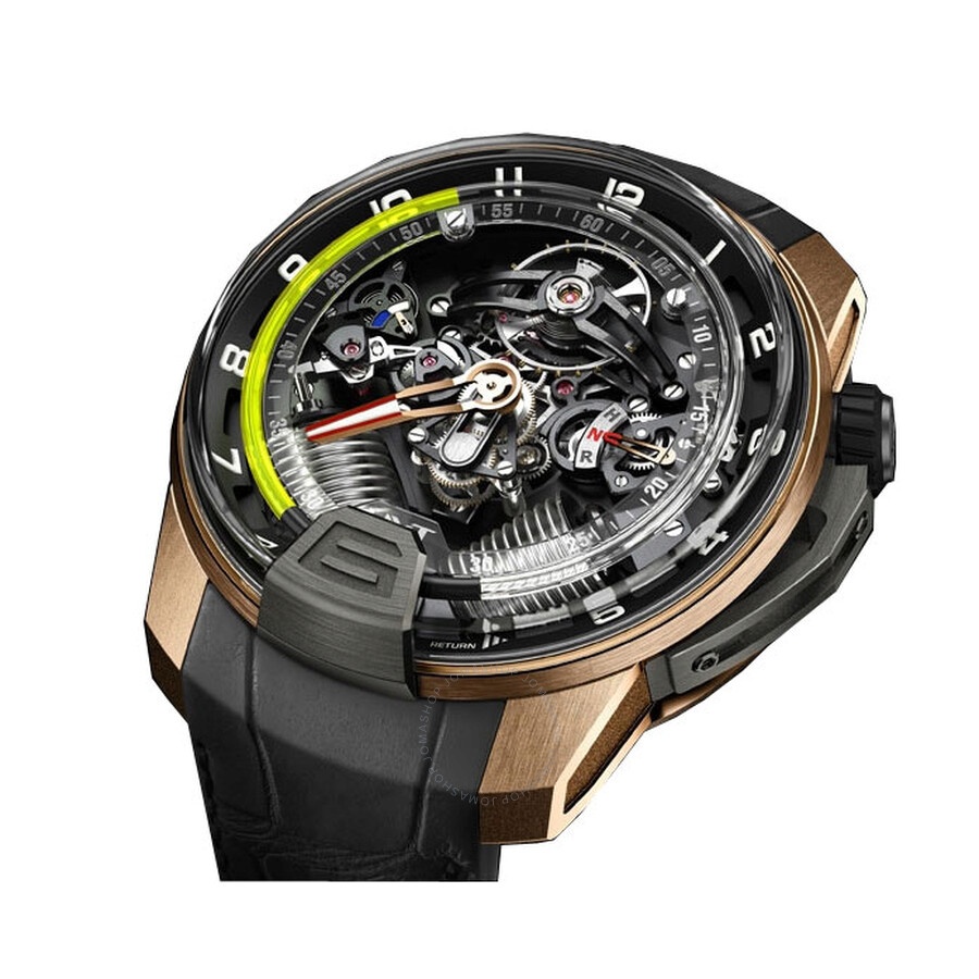 Titanium black dlc and pink gold case with a black alligator rubber strap. Fixed bezel. Alun dial with index hour markers. Luminescent hands and markers. Hand wind movement. Scratch resistant sapphire crystal. Screw down crown. Case diameter: 48.8 mm. Round case shape. Fold over with safety clasp. Water resistant at 50 meters / 165 feet. Functions: retrograde blue fluidic hours; minutes; crown position indicator (h-n-r) ; thermal indicator. Additional Info: hydro fluid system in a closed, waterproof circuit indicates the hour.. Watch label: Swiss Made. HYT H2 Alun Dial Men's Watch 248-DG-00-GF-AB. GENERAL Box Type: Original Box CASE Case Size: 48 Case Material: Titanium Black DLC and Pink Gold Case Shape: Round BAND Band Material: Alligator Rubber Band Type: Strap Band Color: Black Clasp: Fold Over with Safety Release DIAL Dial Color: Alun Type: Analog Crystal: Scratch Resistant Sapphire Dial Markers: Index Luminiscence: Hands and Markers Bezel: Fixed Crown: Screw Down INFORMATION Brand: Hyt Series: H2 Collection Name: H2 Gender: Mens Model: 248-DG-00-GF-AB Watch Label: Swiss Made Movement: Hand Wind Engine: HYT Calibre Power Reserve: 192 hours FEATURES Water Resistance: 50 meters / 165 feet Functions: Retrograde blue fluidic hours; Minutes; Crown position indicator (H-N-R) ; Thermal indicator Watch Features: Alligator Leather, Analog, Retrograde, Gold, Rubber, Titanium ADDITIONAL INFO Watch Style: Luxury Warranty: 2 Year Jomashop Warranty Additional Info: Hydro Fluid system in a closed, waterproof circuit indicates the hour. Jomashop Sku: HYT248-DG-00-GF-AB Item Variation: 248 DG 00 GF AB, 248.DG.00.GF.AB, 248DG00GFAB Department: Watches Category: Watches
