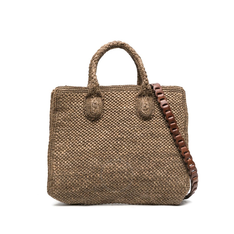 Ibeliv Ladies Tote. SKU: RARY-DARK TEA. Color: Brown. Ibeliv Rary Woven-Raffia Tote Bag. Crafted in a woven raffia design, this elegant tote features two top handles and a detachable braided leather shoulder strap for versatile styling. The magnetic fastening opens to a fully lined main compartment with internal patch pockets and an internal logo patch for organization. Finished with gold-tone hardware for a refined touch. Outer: Calf Leather 100%. GENERAL Color: Brown INFORMATION Brand: Ibeliv Gender: Womens Model: RARY-DARK TEA ADDITIONAL INFO UPC Code: 3760368823006 Jomashop Sku: Z-U96XL Department: Bags Category: Tote Bags