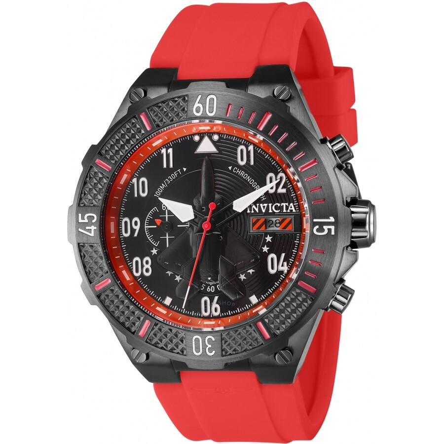 Gunmetal stainless steel case with a red silicone strap. Uni-directional rotating three-tone (white and red and black) stainless steel bezel. Black dial with black hands and Arabic numeral hour markers. Minute markers around the outer rim. Dial Type: Analog. Luminescent hands and markers. Date display at the 3 o'clock position. Chronograph - two sub-dials displaying: 60 second and 60 minute. TMI Caliber VD5F quartz movement. Scratch resistant Flame Fusion crystal. Pull / push crown. Solid case back. Round case shape, case size: 50 mm, case thickness: 16.05 mm. Band width: 26 mm, band length: 8.25 inches. Buckle clasp. Water resistant at 100 meters / 330 feet. Functions: chronograph, date, hour, minute, second. Aviator Series. Sport watch style. Watch label: Japan Movt. Invicta Aviator Chronograph Date Quartz Black Dial Men's Watch 39897. GENERAL Box Type: Original Box CASE Case Diameter: 50 mm Case Thickness: 16.05 mm Case Material: Stainless Steel Case Shape: Round Case Back: Solid BAND Band Material: Silicone Band Type: Strap Band Color: Red Band Length: 8.25 inches Band Width: 26 mm Clasp: Buckle DIAL Dial Color: Black Type: Analog Crystal: Flame Fusion Hands: Black Dial Markers: Arabic Numeral Second Markers: Minute Markers around the outer rim Sub Dials: Two - 60 Second and 60 Minute Luminiscence: Hands and Markers Bezel: Uni-directional Rotating Bezel Color: Three-tone (White and Red and Black) Bezel Material: Stainless Steel Crown: Pull / Push INFORMATION Brand: Invicta Series: Aviator Collection Name: Aviator Gender: Mens Model: 39897 Watch Label: Japan Movt Movement: Quartz Engine: TMI Caliber VD5F FEATURES Water Resistance: 100 meters / 330 feet Calendar: Date display at the 3 o'clock position Functions: Chronograph, Date, Hour, Minute, Second Watch Features: Analog, Stainless Steel, Chronograph ADDITIONAL INFO Watch Style: Sport Warranty: With Manufacturer's Guarantee UPC Code: 886678537662 Jomashop Sku: IN39897 Department: Watches