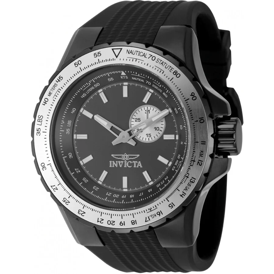 Black stainless steel case with a black silicone strap. Two-tone (silver and black) aluminum and stainless steel bezel. Gunmetal dial with silver-tone hands and index hour markers. Nautical scale around the outer rim. Dial Type: Analog. Luminescent hands and markers. Date display at the 2 o'clock position. One subdial displaying: date. Hattori Caliber VD72 quartz movement. Scratch resistant mineral crystal. Pull / push crown. Solid case back. Round case shape, case size: 50 mm, case thickness: 15.0 mm. Band width: 32.5 mm, band length: 8.75 inches. Buckle clasp. Water resistant at 100 meters / 330 feet. Functions: day, hour, minute. Aviator Series. Casual watch style. Watch label: Japan Movt. Invicta Aviator Quartz Gunmetal Dial Men's Watch 49720. GENERAL Box Type: Original Box CASE Case Diameter: 50 mm Case Thickness: 15.0 mm Case Material: Stainless Steel Case Shape: Round Case Back: Solid BAND Band Material: Silicone Band Type: Strap Band Color: Black Band Length: 8.75 inches Band Width: 32.5 mm Clasp: Buckle DIAL Dial Color: Gunmetal Type: Analog Crystal: Scratch Resistant Mineral Hands: Silver-tone Dial Markers: Index Second Markers: Nautical Scale around the outer rim Sub Dials: One - Date Luminiscence: Hands and Markers Bezel Color: Two-tone (Silver and Black) Bezel Material: Aluminum and Stainless Steel Crown: Pull / Push INFORMATION Brand: Invicta Series: Aviator Collection Name: Aviator Gender: Mens Model: 49720 Watch Label: Japan Movt Movement: Quartz Engine: Hattori Caliber VD72 FEATURES Water Resistance: 100 meters / 330 feet Calendar: Date display at the 2 o'clock position Functions: Day, Hour, Minute Watch Features: Stainless Steel, Analog ADDITIONAL INFO Watch Style: Casual Warranty: With Manufacturer's Guarantee UPC Code: 886678670987 Jomashop Sku: IN49720 Department: Watches