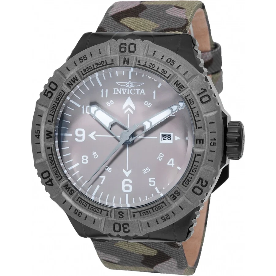 Sandblast and titanium and black stainless steel case with a three-tone (camouflage and green and tan) nylon strap. Uni-directional rotating titanium-tone stainless steel bezel. Khaki dial with titanium-tone hands and Arabic numeral hour markers. Minute markers around the outer rim. Dial Type: Analog. Luminescent hands and markers. Date display at the 3 o'clock position. Hattori Caliber PC32 quartz movement. Scratch resistant mineral crystal. Pull / push crown. Solid case back. Round case shape, case size: 49.00 mm, case thickness: 18.50 mm. Band width: 24 mm, band length: 7.50 inches. Buckle clasp. Water resistant at 100 meters / 330 feet. Functions: date, hour, minute, second. Coalition Forces Series. Casual watch style. Watch label: Japan Movt. Invicta Coalition Forces Quartz Khaki Dial Men's Watch 49512. GENERAL Box Type: Original Box CASE Case Thickness: 18.50 mm Case Material: Stainless Steel Case Shape: Round Case Back: Solid BAND Band Material: Nylon Band Type: Strap Band Color: Three-tone (Camouflage and Green and Tan) Band Length: 7.50 inches Band Width: 24 mm Clasp: Buckle DIAL Dial Color: Khaki Type: Analog Crystal: Scratch Resistant Mineral Hands: Titanium-tone Dial Markers: Arabic Numeral Second Markers: Minute Markers around the outer rim Luminiscence: Hands and Markers Bezel: Uni-directional Rotating Bezel Color: Titanium-tone Bezel Material: Stainless Steel Crown: Pull / Push INFORMATION Brand: Invicta Series: Coalition Forces Collection Name: Coalition Forces Gender: Mens Model: 49512 Watch Label: Japan Movt Movement: Quartz Engine: Hattori Caliber PC32 FEATURES Water Resistance: 100 meters / 330 feet Calendar: Date display at the 3 o'clock position Functions: Date, Hour, Minute, Second Watch Features: Analog, Stainless Steel, Titanium ADDITIONAL INFO Watch Style: Casual Warranty: With Manufacturer's Guarantee UPC Code: 886678666287 Jomashop Sku: IN49512 Department: Watches