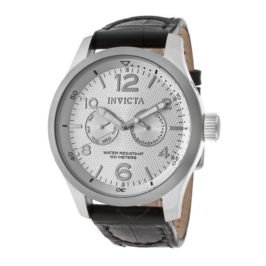 Silver-tone stainless steel case with a black leather strap. Fixed silver-tone stainless steel bezel. Silver-tone dial with silver-tone hands and Arabic numeral and index hour markers. Minute markers around the outer rim. Dial Type: Analog. Luminescent hands. Date display at the 2 o'clock position. Two - date and day subdials. TMI Caliber VH64 quartz movement. Scratch resistant flame fusion crystal. Pull / push crown. Solid case back. Round case shape, case size: 48 mm, case thickness: 13 mm. Band width: 24 mm, band length: 9 inches. Buckle clasp. Water resistant at 100 meters / 330 feet. Functions: date, day, hour, minute, second. Casual watch style. Watch label: Japan Movt. Invicta Force Silver Dial Men's Watch 13008. CASE Case Size: 48 Case Thickness: 13 mm Case Material: Stainless Steel Case Shape: Round Case Back: Solid BAND Band Material: Leather Band Type: Strap Band Color: Black Band Length: 9 inches Band Width: 24 mm Clasp: Buckle DIAL Dial Color: Silver-tone Type: Analog Crystal: Flame Fusion Hands: Silver-tone Dial Markers: Arabic Numeral and Index Second Markers: Minute Markers around the outer rim Sub Dials: Two - Date and Day Luminiscence: Hands Bezel: Fixed Bezel Color: Silver-tone Bezel Material: Stainless Steel Crown: Pull / Push INFORMATION Brand: Invicta Series: Force Collection Name: Force Gender: Mens Model: 13008 Watch Label: Japan Movt Movement: Quartz Engine: TMI Caliber VH64 FEATURES Water Resistance: 100 meters / 330 feet Calendar: Date display at the 2 o'clock position Functions: Date, Day, Hour, Minute, Second Watch Features: Analog, Leather, Stainless Steel ADDITIONAL INFO Watch Style: Casual Warranty: With Manufacturer's Guarantee UPC Code: 886678130085 Jomashop Sku: IN13008 Department: Watches Category: Watches