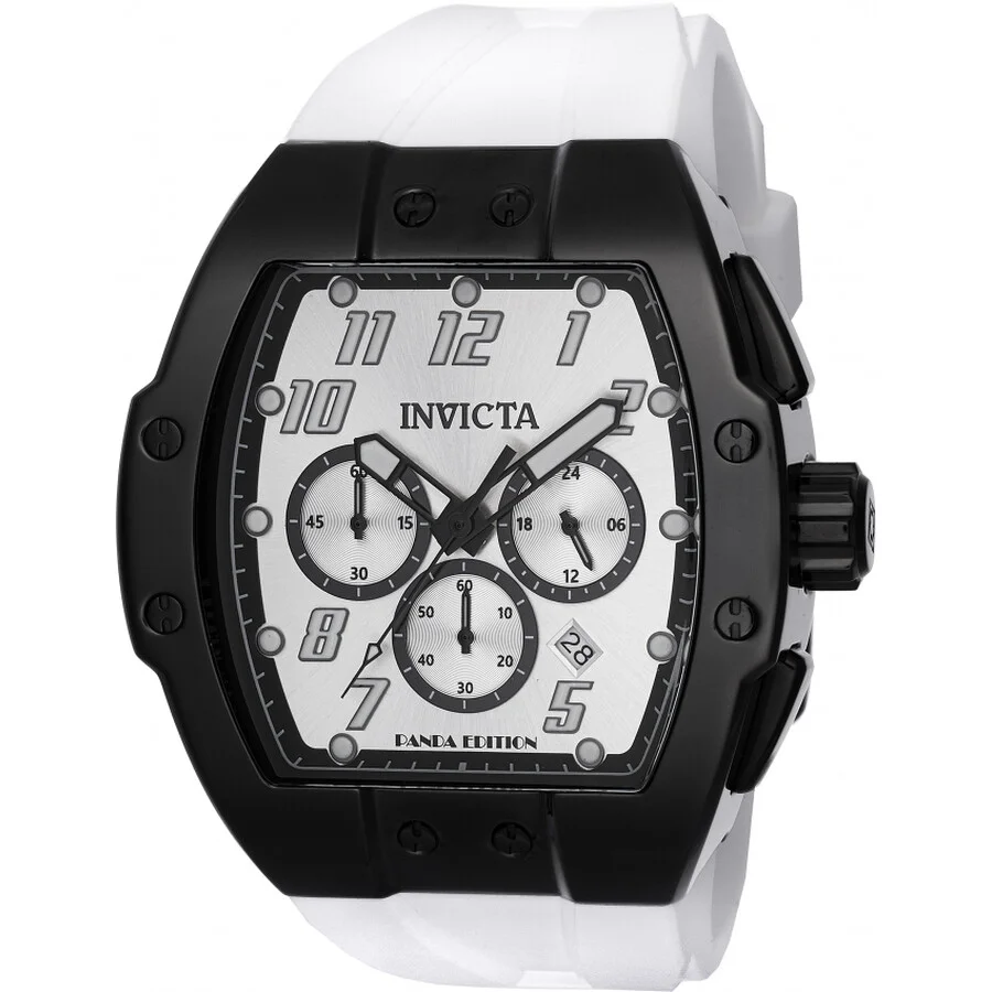 Black stainless steel case with a white silicone strap. Fixed black stainless steel bezel. White dial with black hands and Arabic numeral hour markers. Minute markers around the outer rim. Dial Type: Analog. Luminescent hands and markers. Date display between 4 and 5 o'clock position. Chronograph - three sub-dials displaying: 60 second, 60 minute and 24 hour. Hattori Caliber VD53 quartz movement. Scratch resistant Flame Fusion crystal. Pull / push crown. Solid case back. Tonneau case shape, case size: 47 mm, case thickness: 17, 16.4 mm. Band width: 28 mm, band length: 8.25 inches. Buckle clasp. Water resistant at 50 meters / 165 feet. Functions: chronograph, date, GMT, second time zone, hour, minute, second. Invicta Racing Series. Sport watch style. Watch label: Japan Movt. Invicta Invicta Racing PANDA Chronograph GMT Quartz White Dial Men's Watch 48941. GENERAL Box Type: Original Box CASE Case Thickness: 17, 16.4 mm Case Material: Stainless Steel Case Shape: Tonneau Case Back: Solid BAND Band Material: Silicone Band Type: Strap Band Color: White Band Length: 8.25 inches Band Width: 28 mm Clasp: Buckle DIAL Dial Color: White Type: Analog Crystal: Flame Fusion Hands: Black Dial Markers: Arabic Numeral Second Markers: Minute Markers around the outer rim Sub Dials: Three - 60 second, 60 minute and 24 hour Luminiscence: Hands and Markers Bezel: Fixed Bezel Color: Black Bezel Material: Stainless Steel Crown: Pull / Push INFORMATION Brand: Invicta Series: Invicta Racing Collection Name: Invicta Racing Gender: Mens Model: 48941 Watch Label: Japan Movt Movement: Quartz Engine: Hattori Caliber VD53 FEATURES Water Resistance: 50 meters / 165 feet Calendar: Date display between 4 and 5 o'clock position Functions: Chronograph, Date, GMT, Second Time Zone, Hour, Minute, Second Watch Features: Analog, GMT, Stainless Steel, Chronograph, Time Zone ADDITIONAL INFO Watch Style: Sport Warranty: With Manufacturer's Guarantee UPC Code: 886678656776 Jomashop Sku: IN48941 Department: Watches