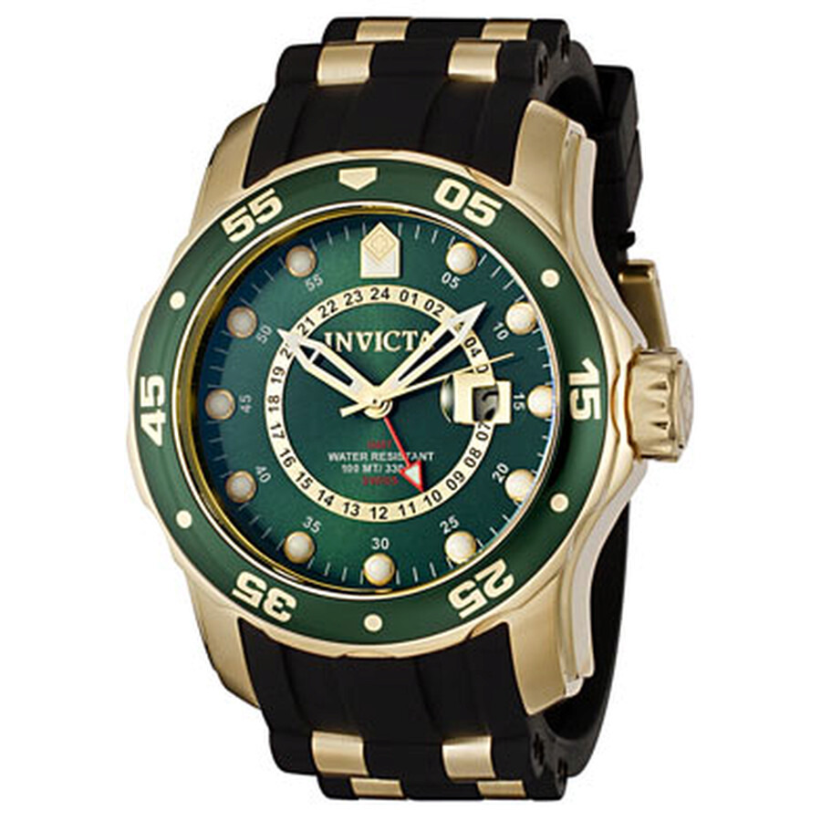 18kt yellow gold-plated stainless steel case with a black polyurethane strap with 18kt yellow gold-plated inserts. Unidirectional 18kt yellow gold-plated bezel with a green top ring. Green dial with luminous yellow gold-tone hands and dot hour markers, Minute markers around the outer rim, GMT scale hour markers. Minute markers around the outer rim. Dial Type: Analog. Luminescent hands and dial markers. Magnified date display at the 3 o'clock position. Suitable for snorkeling, as well as swimming, but not diving quartz movement. Scratch resistant mineral crystal. Pull / push crown. Solid case back. Case size: 49 mm. Case thickness: 17 mm. Round case shape. Band width: 26 mm. Band length: 8.65 inches. Tang clasp. Water resistant at 100 meters / 330 feet. Functions: divers, date, GMT, hour, minute, second. Additional Info: suitable for snorkeling, as well as swimming, but not diving. Sport watch style. Invicta Men's Pro Diver Watch with Black Polyurethane Bracelet 6994. GENERAL Box Type: Original Box Color: Black / Gold / Green / Yellow CASE Case Diameter: 49 mm Case Thickness: 17 mm Case Material: Stainless Steel Case Shape: Round Case Back: Solid BAND Band Material: Polyurethane with 18kt Yellow Gold-plated In Band Type: Strap Band Color: Black Band Length: 8.5 inches Band Width: 26 mm Clasp: Tang DIAL Dial Color: Green Type: Analog Crystal: Scratch Resistant Mineral Hands: Luminous Yellow Gold-tone Dial Markers: Dot Hour Markers, Minute Markers around the outer rim, GMT Scale Second Markers: Minute Markers around the outer rim Luminiscence: Hands and Dial Markers Bezel: Uni-directional Rotating Bezel Color: 18kt Yellow Gold-plated Bezel Material: Stainless Steel with a Green Top Ring Crown: Pull / Push INFORMATION Brand: Invicta Series: Pro Diver Collection Name: Pro Diver Gender: Mens Model: 6994 Movement: Quartz Engine: suitable for snorkeling, as well as swimming, but not diving FEATURES Water Resistance: 100 meters / 330 feet Calendar: Magnified date display at the 3 o'clock position Functions: Divers, Date, GMT, Hour, Minute, Second Watch Features: Analog, GMT, Gold, Stainless Steel ADDITIONAL INFO Watch Style: Sport Warranty: With Manufacturers Guarantee UPC Code: 843836069946 Additional Info: suitable for snorkeling, as well as swimming, but not diving Jomashop Sku: IN6994 Department: Watches Category: Watches