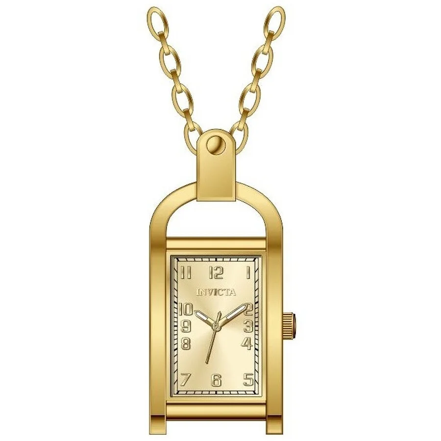 Gold-tone stainless steel case. Fixed gold-tone stainless steel bezel. Gold-tone dial with gold-tone hands and Arabic numeral hour markers. Dial Type: Analog. SII Caliber PC11 quartz movement. Scratch resistant mineral crystal. Pull / push crown. Solid case back. Unique case shape, case size: 17.5 mm, case thickness: 8.50 mm. Band width: 609.6 mm. None clasp. Water resistant at 30 meters / 100 feet. Functions: hour, minute, second. Mini Series. Casual watch style. Watch label: Japan Movt. Invicta Mini Angel Quartz Gold Dial Ladies Watch 49935. GENERAL Box Type: Original Box CASE Case Thickness: 8.50 mm Case Material: Stainless Steel Case Shape: Unique Case Back: Solid BAND Band Width: 609.6 mm DIAL Dial Color: Gold-tone Type: Analog Crystal: Scratch Resistant Mineral Hands: Gold-tone Dial Markers: Arabic Numeral Bezel: Fixed Bezel Color: Gold-tone Bezel Material: Stainless Steel Crown: Pull / Push INFORMATION Brand: Invicta Series: Mini Collection Name: Mini Gender: Womens Model: 49935 Watch Label: Japan Movt Movement: Quartz Engine: SII Caliber PC11 FEATURES Water Resistance: 30 meters / 100 feet Functions: Hour, Minute, Second Watch Features: Stainless Steel, Gold, Analog ADDITIONAL INFO Watch Style: Casual Warranty: With Manufacturer's Guarantee UPC Code: 886678673858 Jomashop Sku: IN49935 Department: Watches