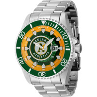 Silver-tone stainless steel case and bracelet. Uni-directional rotating white and silver and green stainless steel bezel. Green and yellow and silver and white dial with silver-tone hands and index hour markers. Minute markers around the outer rim. Dial Type: Analog. Luminescent hands and markers. Date display at the 3 o'clock position. Hattori Caliber PC32 quartz movement. Scratch resistant Flame Fusion crystal. Pull / push crown. Solid case back. Round case shape, case size: 47 mm. Band width: 24 mm, band length: 7.50 inches. Fold over clasp. Water resistant at 100 meters / 330 feet. Functions: date, hour, minute, second. Mlb Series. Casual watch style. Watch label: Japan Movt. Invicta MLB Oakland Athletics Quartz Men's Watch 43473. INFORMATION Brand: Invicta Series: Mlb Collection Name: MLB Gender: Mens Model: 43473 Watch Label: Japan Movt Movement: Quartz Engine: Hattori Caliber PC32 CASE Case Size: 47 mm Case Material: Stainless Steel Case Shape: Round Case Back: Solid BAND Band Material: Stainless Steel Band Type: Bracelet Band Color: Silver-tone Band Length: 7.50 inches Band Width: 24 mm Clasp: Fold Over DIAL Dial Color: Green and Yellow and Silver and White Type: Analog Crystal: Flame Fusion Hands: Silver-tone Dial Markers: Index Second Markers: Minute Markers around the outer rim Luminiscence: Hands and Markers Bezel: Uni-directional Rotating Bezel Color: White and Silver and Green Bezel Material: Stainless Steel Crown: Pull / Push FEATURES Water Resistance: 100 meters / 330 feet Calendar: Date display at the 3 o'clock position Functions: Date, Hour, Minute, Second Watch Features: Stainless Steel, Analog ADDITIONAL INFO Watch Style: Casual Warranty: With Manufacturer's Guarantee UPC Code: 886678576418 Jomashop Sku: IN43473 Department: Watches Category: Watches