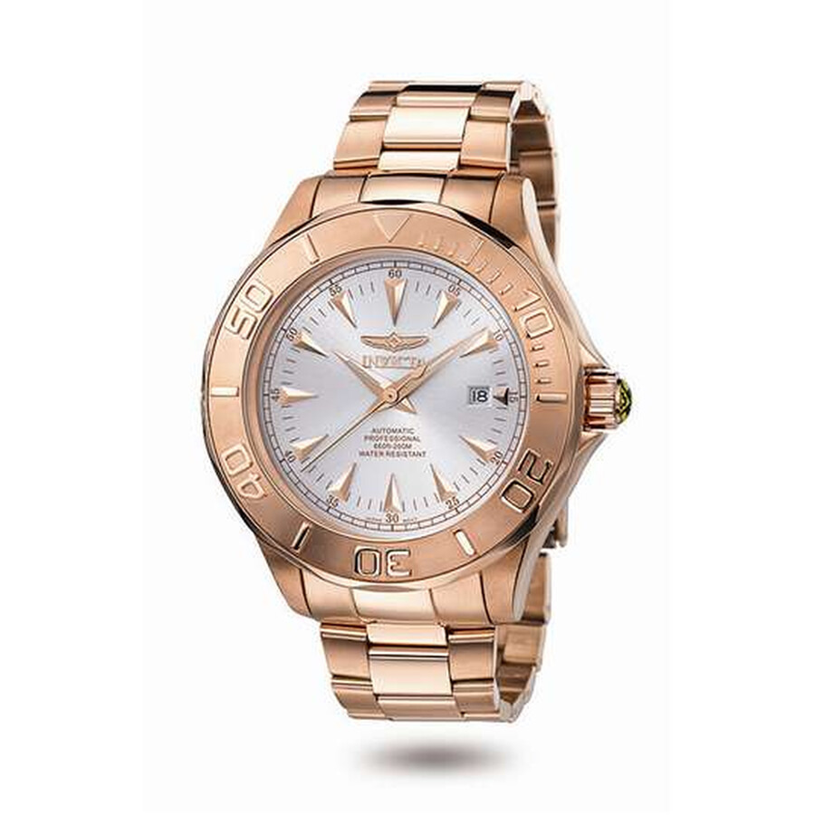 23kt rose gold-plated stainless steel case and bracelet. Unidirectional rotating 23kt rose gold-plated bezel. Silver dial with luminous hands and index hour markers. Minute markers around the outer rim. Dial Type: Analog. Luminescent hands and dial markers. Date displays at the 3 o'clock position. Automatic movement with a 41-hour power reserve. Scratch resistant mineral crystal. Screw down crown. Skeleton case back. Case diameter: 47 mm. Round case shape. Band width: 22 mm. Deployment clasp. Water resistant at 200 meters / 660 feet. Functions: hours, minutes, seconds, calendar. Dress watch style. Invicta Ocean Ghost III Rose Gold Men's Watch 7111. GENERAL Box Type: Original Box Color: Gold / Rose / Silver / Skeleton CASE Case Material: 23kt Rose Gold-plated Stainless Steel Case Shape: Round Case Back: Skeleton BAND Band Material: 23kt Rose Gold-plated Stainless Steel Band Type: Bracelet Band Color: Rose Gold-plated Band Width: 22 mm Clasp: Deployment DIAL Dial Color: Silver Type: Analog Crystal: Scratch Resistant Mineral Hands: Luminous Dial Markers: Index Second Markers: Minute markers around the outer rim Luminiscence: Hands and Dial Markers Bezel: Uni-directional Rotating 23kt Rose Gold-plated Crown: Screw Down INFORMATION Brand: Invicta Series: Ocean Ghost Iii Collection Name: Ocean Ghost III Gender: Mens Model: 7111 Watch Label: Japan Movt Movement: Automatic Engine: SII Caliber NH35A Power Reserve: 41 hours FEATURES Water Resistance: 200 meters / 660 feet Calendar: Date display at the 3 o'clock position Functions: Hours, Minutes, Seconds, Calendar Watch Features: Analog, Gold, Stainless Steel ADDITIONAL INFO Watch Style: Dress Warranty: With Manufacturers Guarantee UPC Code: 843836071116 Jomashop Sku: IN7111 Department: Watches Category: Watches