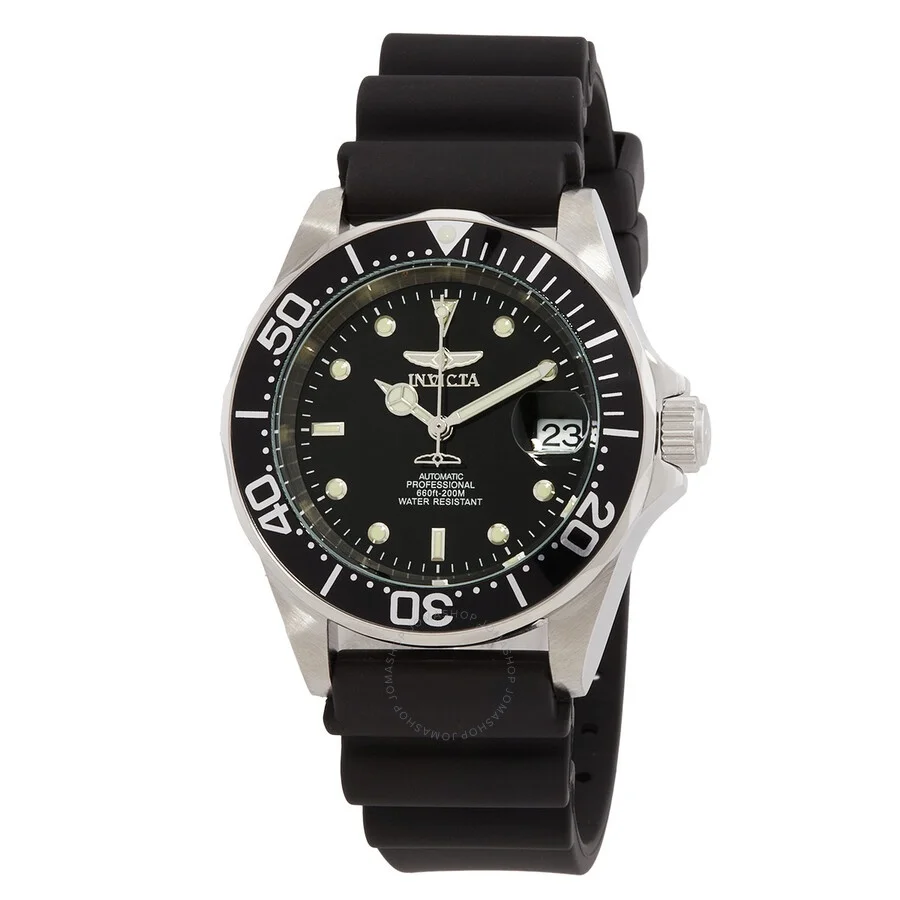 Stainless steel case with a black rubber strap. Uni-directional rotating stainless steel bezel with an inlaid black ion-plated ring. Black dial with luminous hands and dot hour markers. Minute markers around the outer rim. Dial Type: Analog. Luminescent hands and markers. Date display at the 3 o'clock position. SII caliber NH35A automatic movement, containing 24 Jewels, bitting at 21600 vph, and has a power reserve of approximately 41 hours. Scratch resistant mineral crystal. Screw down crown. Skeleton case back. Round case shape. Case size: 40 mm. Case thickness: 14 mm. Band width: 20 mm. Band length: 9.5 inches. Tang clasp. Water resistant at 200 meters / 660 feet. Functions: date, hour, minute, second. Additional Info: date displays at 3 o'clock position. Pro Diver Series. Casual watch style. Watch label: Japan Movt. Invicta Pro Diver Automatic Steel Black Rubber Men's Watch 9110. GENERAL Color: Black / Skeleton INFORMATION Brand: Invicta Series: Pro Diver Collection Name: Pro Diver Gender: Mens Model: 9110 Watch Label: Japan Movt Movement: Automatic Engine: SII Caliber NH35A Power Reserve: 41 hours CASE Case Size: 40 mm Case Thickness: 14 mm Case Material: Stainless Steel Case Shape: Round Case Back: Skeleton BAND Band Material: Rubber Band Type: Strap Band Color: Black Band Length: 9.5 inches Band Width: 20 mm Clasp: Tang DIAL Dial Color: Black Type: Analog Crystal: Scratch Resistant Mineral Hands: Luminous Dial Markers: Dot Second Markers: Minute Markers around the outer rim Luminiscence: Hands and Markers Bezel: Uni-directional Rotating Bezel Color: Black Ion-plated Bezel Material: Stainless Steel with an inlaid Black Ion-plated Ring Crown: Screw Down FEATURES Water Resistance: 200 meters / 660 feet Calendar: Date display at the 3 o'clock position Functions: Date, Hour, Minute, Second Watch Features: Stainless Steel, Rubber, Analog ADDITIONAL INFO Watch Style: Casual Warranty: With Manufacturers Guarantee UPC Code: 843836091107 Additional Info: Date Displays At 3 O'clock Position Jomashop Sku: IN9110 Department: Watches Category: Watches