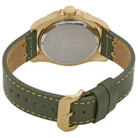 Gold-plated stainless steel case with a navy green leather strap. Uni-directional rotating gold-plated bezel with an inlaid black top ring. Black dial with luminous gold-tone Mercedes-logo, sword, and Breguet-style shape hands and dot and index hour markers. Minute markers around the outer rim. Dial Type: Analog. Luminescent hands and markers. Date display at the 3 o'clock position. Hattori caliber PC32A quartz movement. Scratch resistant flame fusion crystal. Screw down crown. Solid case back. Round case shape. Case size: 43 mm. Case thickness: 13 mm. Band width: 22 mm, band length: 8.65 inches. Tang clasp. Water resistant at 200 meters / 660 feet. Functions: date, hour, minute, second. Casual watch style. Watch label: Japan Movt. Invicta Pro Diver Black Dial Green Leather Men's Watch 22075. GENERAL Box Type: Original Box CASE Case Diameter: 43 mm Case Thickness: 13 mm Case Material: Stainless Steel Case Shape: Round Case Back: Solid BAND Band Material: Leather Band Type: Strap Band Color: Navy Green Band Length: 8.5 inches Band Width: 22 mm Clasp: Tang DIAL Dial Color: Black Type: Analog Crystal: Flame Fusion Hands: Luminous Gold-tone Mercedes-logo, sword, and Breguet-style shape Dial Markers: Dot and Index Second Markers: Minute Markers around the outer rim Luminiscence: Hands and Markers Bezel: Uni-directional Rotating Bezel Color: Gold-plated Bezel Material: Stainless Steel with Black Top Ring Crown: Screw Down INFORMATION Brand: Invicta Series: Pro Diver Collection Name: Pro Diver Gender: Mens Model: 22075 Watch Label: Japan Movt Movement: Quartz Engine: Hattori Caliber PC32A FEATURES Water Resistance: 200 meters / 660 feet Calendar: Date display at the 3 o'clock position Functions: Date, Hour, Minute, Second Watch Features: Analog, Gold, Leather, Stainless Steel ADDITIONAL INFO Watch Style: Casual Warranty: With Manufacturers Guarantee UPC Code: 886678270750 Jomashop Sku: IN22075 Department: Watches Category: Watches
