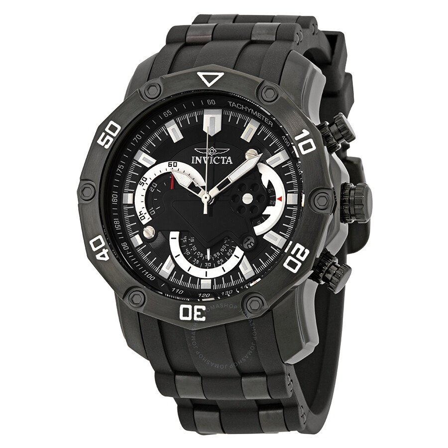 Black ion-plated stainless steel case with a black silicone strap with black ion-plated inserts . Uni-directional rotating black ion-plated bezel. Black dial with luminous silver-tone hands and index hour markers. Minute markers. Tachymeter markings around the outer rim. Dial Type: Analog. Luminescent hands and markers. Date display between the 4 and 5 o'clock positions. Chronograph - three sub-dials displaying: 60 second, 30 minute and 1/10th of a second. Caliber: 6371C quartz movement. Scratch resistant flame fusion crystal. Pull / push crown. Solid case back. Case size: 50 mm. Round case shape. Band width: 26 mm. Band length: 7.7 inches. Tang clasp. Water resistant at 100 meters / 330 feet. Functions: chronograph, tachymeter, date, hour, minute, second. Casual watch style. Invicta Pro Diver Chronograph Black Dial Men's Watch 22799. GENERAL Box Type: Original Box CASE Case Size: 50 Case Material: Stainless Steel Case Shape: Round Case Back: Solid BAND Band Material: Silicone with Black Ion-plated Stainless Steel Ins Band Type: Strap Band Color: Black Band Length: 7.75 inches Band Width: 26 mm Clasp: Tang DIAL Dial Color: Black Type: Analog Crystal: Flame Fusion Hands: Luminous Silver-tone Dial Markers: Index Second Markers: Minute Markers. Tachymeter Markings around the outer rim Sub Dials: Three - 60 Second, 30 Minute and 1/10th of a Second Luminiscence: Hands and Markers Bezel: Uni-directional Rotating Bezel Color: Black Ion-plated Bezel Material: Stainless Steel Crown: Pull / Push INFORMATION Brand: Invicta Series: Pro Diver Collection Name: Pro Diver Gender: Mens Model: 22799 Movement: Quartz Engine: ISA Caliber 6371C FEATURES Water Resistance: 100 meters / 330 feet Calendar: Date display between 4 and 5 o'clock position Functions: Chronograph, Date, Hour, Minute, Second, Tachymeter Watch Features: Analog, Stainless Steel, Chronograph ADDITIONAL INFO Watch Style: Casual Warranty: With Manufacturers Guarantee UPC Code: 886678278725 Jomashop Sku: IN22799 Department: Watches Category: Watches