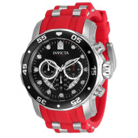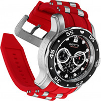 Silver-tone stainless steel case with a two-tone (red and silver-tone) silicone and stainless steel strap. Uni-directional rotating three-tone (white and silver and black) stainless steel bezel. Black dial with silver-tone hands and index hour markers. Minute markers around the outer rim. Dial Type: Analog. Luminescent hands and markers. Date display between 4 and 5 o'clock position. Chronograph - three sub-dials displaying: 60 second, 60 minute and 24 hour. Hattori Caliber VD53 quartz movement. Scratch resistant Flame Fusion crystal. Pull / push crown. Solid case back. Round case shape, case size: 48 mm, case thickness: 12 mm. Band width: 26 mm, band length: 8.25 inches. Buckle clasp. Water resistant at 100 meters / 330 feet. Functions: chronograph, date, GMT, second time zone, hour, minute, second. Pro Diver Series. Sport watch style. Watch label: Japan Movt. Invicta Pro Diver Chronograph GMT Quartz Black Dial Men's Watch 34009. CASE Case Size: 48 Case Thickness: 12 mm Case Material: Stainless Steel Case Shape: Round Case Back: Solid BAND Band Material: Silicone and Stainless Steel Band Type: Strap Band Color: Two-tone (Red and Silver-tone) Band Length: 8.25 inches Band Width: 26 mm Clasp: Buckle DIAL Dial Color: Black Type: Analog Crystal: Flame Fusion Hands: Silver-tone Dial Markers: Index Second Markers: Minute Markers around the outer rim Sub Dials: Three - 60 second, 60 minute and 24 hour Luminiscence: Hands and Markers Bezel: Uni-directional Rotating Bezel Color: Three-tone (White and Silver and Black) Bezel Material: Stainless Steel Crown: Pull / Push INFORMATION Brand: Invicta Series: Pro Diver Collection Name: Pro Diver Gender: Mens Model: 34009 Watch Label: Japan Movt Movement: Quartz Engine: Hattori Caliber VD53 FEATURES Water Resistance: 100 meters / 330 feet Calendar: Date display between 4 and 5 o'clock position Functions: Chronograph, Date, GMT, Second Time Zone, Hour, Minute, Second Watch Features: Analog, GMT, Stainless Steel, Chronograph, Time Zone ADDITIONAL INFO Watch Style: Sport Warranty: With Manufacturer's Guarantee UPC Code: 886678406784 Jomashop Sku: IN34009 Department: Watches