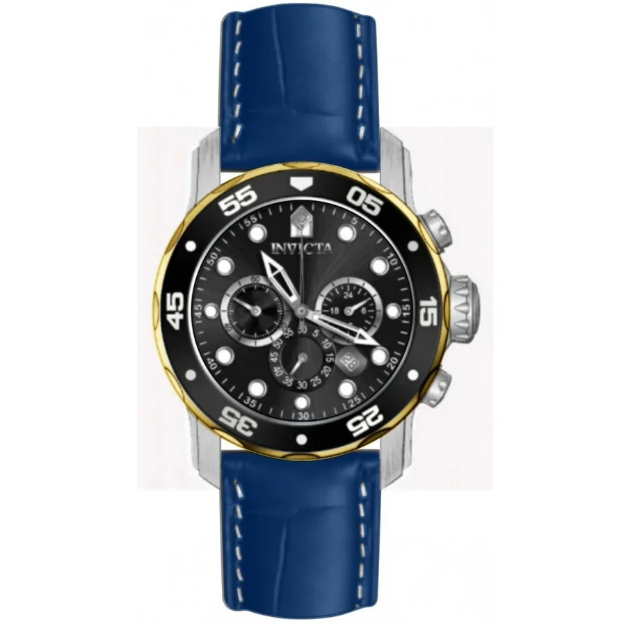 Silver-tone and gold stainless steel case with a blue leather strap. Uni-directional rotating two-tone (gold and black) aluminum and stainless steel bezel. Black dial with silver-tone hands and index hour markers. Minute markers around the outer rim. Dial Type: Analog. Luminescent hands and markers. Date display between 4 and 5 o'clock position. Chronograph - three sub-dials displaying: 60 second, 60 minute and 24 hour. Hattori Caliber VD53 quartz movement. Scratch resistant mineral crystal. Pull / push crown. Solid case back. Round case shape, case size: 48 mm, case thickness: 16.70 mm. Band width: 26 mm, band length: 8.50 inches. Buckle clasp. Water resistant at 200 meters / 660 feet. Functions: chronograph, date, GMT, second time zone, hour, minute, second. Pro Diver Series. Sport watch style. Watch label: Japan Movt. Invicta Pro Diver Chronograph GMT Quartz Black Dial Men's Watch 49831. GENERAL Box Type: Original Box CASE Case Thickness: 16.70 mm Case Material: Stainless Steel Case Shape: Round Case Back: Solid BAND Band Material: Leather Band Type: Strap Band Color: Blue Band Length: 8.50 inches Band Width: 26 mm Clasp: Buckle DIAL Dial Color: Black Type: Analog Crystal: Scratch Resistant Mineral Hands: Silver-tone Dial Markers: Index Second Markers: Minute Markers around the outer rim Sub Dials: Three - 60 second, 60 minute and 24 hour Luminiscence: Hands and Markers Bezel: Uni-directional Rotating Bezel Color: Two-tone (Gold and Black) Bezel Material: Aluminum and Stainless Steel Crown: Pull / Push INFORMATION Brand: Invicta Series: Pro Diver Collection Name: Pro Diver Gender: Mens Model: 49831 Watch Label: Japan Movt Movement: Quartz Engine: Hattori Caliber VD53 FEATURES Water Resistance: 200 meters / 660 feet Calendar: Date display between 4 and 5 o'clock position Functions: Chronograph, Date, GMT, Second Time Zone, Hour, Minute, Second Watch Features: Analog, GMT, Gold, Leather, Stainless Steel, Chronograph, Time Zone ADDITIONAL INFO Watch Style: Sport Warranty: With Manufacturer's Guarantee UPC Code: 886678672844 Jomashop Sku: IN49831 Department: Watches
