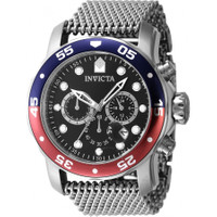 Silver-tone stainless steel case with a silver-tone stainless steel mesh bracelet. Uni-directional pepsi (red and blue) aluminum and stainless steel and 0 bezel. Black dial with silver-tone hands and index hour markers. Minute markers around the outer rim. Dial Type: Analog. Luminescent hands and markers. Date display between 4 and 5 o'clock position. Chronograph - three sub-dials displaying: 60 second, 60 minute and 24 hour. Hattori Caliber VD53 quartz movement. Scratch resistant Flame Fusion crystal. Pull / push crown. Solid case back. Round case shape, case size: 48 mm, case thickness: 16.70 mm. Band width: 26 mm, band length: 7.25 inches. Fold over safety clasp. Water resistant at 200 meters / 660 feet. Functions: chronograph, date, GMT, second time zone, hour, minute, second. Pro Diver Series. Sport watch style. Watch label: Japan Movt. Invicta Pro Diver Chronograph GMT Quartz Black Dial Pepsi Bezel Men's Watch 47630. CASE Case Size: 48 Case Thickness: 16.70 mm Case Material: Stainless Steel Case Shape: Round Case Back: Solid BAND Band Material: Stainless Steel Mesh Band Type: Bracelet Band Color: Silver-tone Band Length: 7.25 inches Band Width: 26 mm Clasp: Fold over safety DIAL Dial Color: Black Type: Analog Crystal: Flame Fusion Hands: Silver-tone Dial Markers: Index Second Markers: Minute Markers around the outer rim Sub Dials: Three - 60 second, 60 minute and 24 hour Luminiscence: Hands and Markers Bezel: Uni-directional Bezel Color: Pepsi (Red and Blue) Bezel Material: Aluminum and Stainless Steel and 0 Crown: Pull / Push INFORMATION Brand: Invicta Series: Pro Diver Collection Name: Pro Diver Gender: Mens Model: 47630 Watch Label: Japan Movt Movement: Quartz Engine: Hattori Caliber VD53 FEATURES Water Resistance: 200 meters / 660 feet Calendar: Date display between 4 and 5 o'clock position Functions: Chronograph, Date, GMT, Second Time Zone, Hour, Minute, Second Watch Features: Analog, GMT, Stainless Steel, Chronograph, Time Zone ADDITIONAL INFO Watch Style: Sport Warranty: With Manufacturer's Guarantee UPC Code: 886678634033 Jomashop Sku: IN47630 Department: Watches