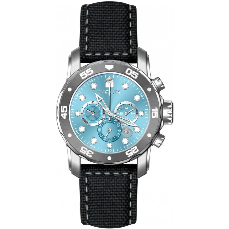 Silver-tone stainless steel case with a black canvas strap. Uni-directional rotating two-tone (charcoal and silver-tone) aluminum and stainless steel bezel. Light blue dial with silver-tone hands and index hour markers. Minute markers around the outer rim. Dial Type: Analog. Luminescent hands and markers. Date display between 4 and 5 o'clock position. Chronograph - three sub-dials displaying: 60 second, 60 minute and 24 hour. Hattori Caliber VD53 quartz movement. Scratch resistant mineral crystal. Pull / push crown. Solid case back. Round case shape, case size: 48 mm, case thickness: 16.70 mm. Band width: 26 mm, band length: 8.50 inches. Buckle clasp. Water resistant at 200 meters / 660 feet. Functions: chronograph, date, GMT, second time zone, hour, minute, second. Pro Diver Series. Sport watch style. Watch label: Japan Movt. Invicta Pro Diver Chronograph GMT Quartz Light Blue Dial Men's Watch 49835. GENERAL Box Type: Original Box CASE Case Thickness: 16.70 mm Case Material: Stainless Steel Case Shape: Round Case Back: Solid BAND Band Material: Canvas Band Type: Strap Band Color: Black Band Length: 8.50 inches Band Width: 26 mm Clasp: Buckle DIAL Dial Color: Light Blue Type: Analog Crystal: Scratch Resistant Mineral Hands: Silver-tone Dial Markers: Index Second Markers: Minute Markers around the outer rim Sub Dials: Three - 60 second, 60 minute and 24 hour Luminiscence: Hands and Markers Bezel: Uni-directional Rotating Bezel Color: Two-tone (Charcoal and Silver-tone) Bezel Material: Aluminum and Stainless Steel Crown: Pull / Push INFORMATION Brand: Invicta Series: Pro Diver Collection Name: Pro Diver Gender: Mens Model: 49835 Watch Label: Japan Movt Movement: Quartz Engine: Hattori Caliber VD53 FEATURES Water Resistance: 200 meters / 660 feet Calendar: Date display between 4 and 5 o'clock position Functions: Chronograph, Date, GMT, Second Time Zone, Hour, Minute, Second Watch Features: Analog, GMT, Stainless Steel, Chronograph, Time Zone ADDITIONAL INFO Watch Style: Sport Warranty: With Manufacturer's Guarantee UPC Code: 886678672882 Jomashop Sku: IN49835 Department: Watches