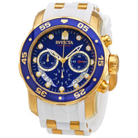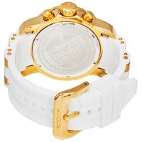 Gold-plated stainless steel case with a white polyurethane strap with gold-plated accents. Uni-directional rotating gold-plated bezel with blue top ring. Mother of pearl dial with gold-tone skeleton hands and dot hour markers. Minute markers around the outer rim. Dial Type: Analog. Luminescent hands and markers. Date display between the 4 and 5 o'clock positions. Chronograph - three sub-dials displaying: 60 second, 30 minute and 1/10th of a second. Quartz movement. Scratch resistant flame fusion crystal. Pull / push crown. Solid case back. Case diameter: 48 mm. Case thickness: 17 mm. Round case shape. Band width: 26 mm. Band length: 8.25 inches. Tang clasp. Water resistant at 100 meters / 330 feet. Functions: chronograph, date, hour, minute, second. Casual watch style. Invicta Pro Diver Chronograph Mother of Pearl White Polyurethane Men's Watch 20288. INFORMATION Brand: Invicta Series: Pro Diver Collection Name: Pro Diver Gender: Mens Model: 20288 Watch Label: Swiss Movt Movement: Quartz Engine: Ronda Caliber 5040.D CASE Case Size: 48 mm Case Thickness: 17 mm Case Material: Stainless Steel Case Shape: Round Case Back: Solid BAND Band Material: Polyurethane with Gold-plated accents Band Type: Strap Band Color: Two-tone (White and Gold-tone) Band Length: 8.25 inches Band Width: 26 mm Clasp: Tang DIAL Dial Color: Mother of Pearl Type: Analog Crystal: Flame Fusion Hands: Gold-tone Skeleton Dial Markers: Dot Second Markers: Minute Markers around the outer rim Sub Dials: Three - 60 Second, 30 Minute and 1/10th of a Second Luminiscence: Hands and Markers Bezel: Uni-directional Rotating Bezel Color: Gold-plated Bezel Material: Stainless Steel with Blue Top Ring Crown: Pull / Push FEATURES Water Resistance: 100 meters / 330 feet Calendar: Date display between 4 and 5 o'clock position Functions: Chronograph, Date, Hour, Minute, Second Watch Features: Chronograph, Stainless Steel, Gold, Analog ADDITIONAL INFO Watch Style: Sport Warranty: With Manufacturers Guarantee UPC Code: 886678251001 Jomashop Sku: IN20288 Department: Watches Category: Watches