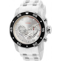 Stainless steel case with a white polyurethane strap with stainless steel inserts. Uni-directional rotating stainless steel bezel with an inlaid black ring. Silver dial with silver-tone skeleton hands and dot hour markers. Minute markers around the outer rim. Dial Type: Analog. Luminescent hands and markers. Date display between the 4 and 5 o'clock positions. Chronograph - three sub-dials displaying: 60 second, 30 minute and 1/10th of a second. Ronda caliber 5040.D quartz movement. Scratch resistant Flame Fusion crystal. Pull / push crown. Solid case back. Round case shape. Case size: 48 mm. Case thickness: 17 mm. Band width: 26 mm. Band length: 8.25 inches. Tang clasp. Water resistant at 100 meters / 330 feet. Functions: chronograph, date, hour, minute, second. Additional Info: in general, suitable for swimming and snorkeling, but not diving. Pro Diver Series. Casual watch style. Invicta Pro Diver Chronograph Silver Dial Men's Watch 20290. INFORMATION Brand: Invicta Series: Pro Diver Collection Name: Pro Diver Gender: Mens Model: 20290 Watch Label: Swiss Movt Movement: Quartz Engine: Ronda Caliber 5040.D CASE Case Size: 48 mm Case Thickness: 17 mm Case Material: Stainless Steel Case Shape: Round Case Back: Solid BAND Band Material: Polyurethane with Stainless Steel Inserts Band Type: Strap Band Color: White Band Length: 8.25 inches Band Width: 26 mm Clasp: Tang DIAL Dial Color: Silver Type: Analog Crystal: Flame Fusion Hands: Silver-tone Skeleton Dial Markers: Dot Second Markers: Minute Markers around the outer rim Sub Dials: Three - 60 Second, 30 Minute and 1/10th of a Second Luminiscence: Hands and Markers Bezel: Uni-directional Rotating Bezel Color: Silver-tone Bezel Material: Stainless Steel with an inlaid Black Ring Crown: Pull / Push FEATURES Water Resistance: 100 meters / 330 feet Calendar: Date display between the 4 and 5 o'clock positions Functions: Chronograph, Date, Hour, Minute, Second Watch Features: Chronograph, Stainless Steel, Analog ADDITIONAL INFO Watch Style: Casual Warranty: With Manufacturers Guarantee UPC Code: 886678251025 Additional Info: in general, suitable for swimming and snorkeling, but not diving Jomashop Sku: IN20290 Department: Watches Category: Watches
