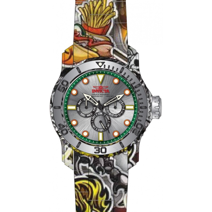 Silver-tone and aqua-plating and silver and black aluminum and stainless steel case with a aqua plating stainless steel bracelet. Multi-tone (aqua-plating and silver-tone and silver and black) aluminum and stainless steel bezel. Silver dial with black hands and index hour markers. Minute markers around the outer rim. Dial Type: Analog. Luminescent hands and markers. Date display at the 3 o'clock position. Three sub-dials displaying: date, day and 24 hour. TMI Caliber VH63 quartz movement. Scratch resistant mineral crystal. Screw down crown. Solid case back. Round case shape, case size: 48.8 mm, case thickness: 16.65 mm. Band width: 26 mm, band length: 8.25 inches. Fold over safety clasp. Water resistant at 100 meters / 330 feet. Functions: date, day, second time zone, hour, minute, second. Pro Diver Series. Casual watch style. Watch label: Japan Movt. Invicta Pro Diver Date Day Quartz Silver Dial Men's Watch 47854. CASE Case Size: 48 Case Thickness: 16.65 mm Case Material: Aluminum and Stainless Steel Case Shape: Round Case Back: Solid BAND Band Material: Stainless Steel Band Type: Bracelet Band Color: Aqua Plating Band Length: 8.25 inches Band Width: 26 mm Clasp: Fold over safety DIAL Dial Color: Silver Type: Analog Crystal: Scratch Resistant Mineral Hands: Black Dial Markers: Index Second Markers: Minute Markers around the outer rim Sub Dials: Three - Date, Day and 24 Hour Luminiscence: Hands and Markers Bezel Color: Multi-tone (Aqua-Plating and Silver-tone and Silver and Black) Bezel Material: Aluminum and Stainless Steel Crown: Screw Down INFORMATION Brand: Invicta Series: Pro Diver Collection Name: Pro Diver Gender: Mens Model: 47854 Watch Label: Japan Movt Movement: Quartz Engine: TMI Caliber VH63 FEATURES Water Resistance: 100 meters / 330 feet Calendar: Date display at the 3 o'clock position Functions: Date, Day, Second Time Zone, Hour, Minute, Second Watch Features: Time Zone, Stainless Steel, Analog ADDITIONAL INFO Watch Style: Casual Warranty: With Manufacturer's Guarantee UPC Code: 886678637867 Jomashop Sku: IN47854 Department: Watches