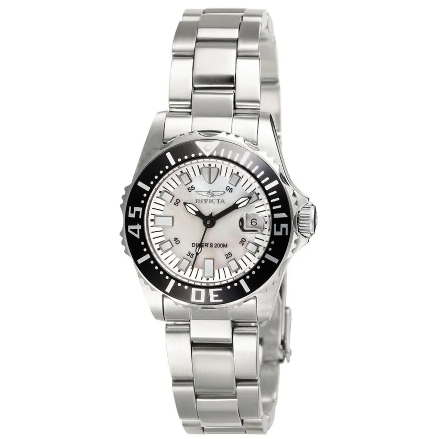 Stainless steel case with a stainless steel bracelet. Uni-directional rotating stainless steel bezel with an inlaid black ring. Mother of pearl dial with luminous hands and index hour markers. Arabic numeral minute markers (at 5 minute intervals). Minute markers around the outer rim. Dial Type: Analog. Luminescent hands and markers. Date display at the 3 o'clock position. Ronda caliber 585 quartz movement. Scratch resistant mineral crystal. Solid case back. Round case shape. Case size: 32 mm. Case thickness: 6 mm. Band width: 14 mm. Band length: 8 inches. Fold over clasp with a safety release. Water resistant at 200 meters / 660 feet. Functions: date, hour, minute, second. Pro Diver Series. Dress watch style. Invicta Pro Diver Lady Abyss Mother of Pearl Dial Ladies Watch 2958. GENERAL Box Type: Original Box Color: Black / Mother of pearl / Silver CASE Case Diameter: 32 mm Case Thickness: 6 mm Case Material: Stainless Steel Case Shape: Round Case Back: Solid BAND Band Material: Stainless Steel Band Type: Bracelet Band Color: Silver-tone Band Length: 8 inches Band Width: 14 mm Clasp: Fold over with Safety Release DIAL Dial Color: Mother of Pearl Type: Analog Crystal: Scratch Resistant Mineral Hands: Luminous Dial Markers: Index Second Markers: Arabic Numeral Minute Markers (at 5 minute intervals). Minute markers around the outer rim Luminiscence: Hands and Markers Bezel: Uni-directional Rotating Bezel Color: Silver-tone Bezel Material: Stainless Steel Crown: Screw Down INFORMATION Brand: Invicta Series: Pro Diver Collection Name: Pro Diver Gender: Womens Model: 2958 Watch Label: Swiss Movt Movement: Quartz Engine: Ronda Caliber 585 FEATURES Water Resistance: 200 meters / 660 feet Calendar: Date display at the 3 o'clock position Functions: Date, Hour, Minute, Second Watch Features: Analog, Stainless Steel ADDITIONAL INFO Watch Style: Dress Warranty: With Manufacturers Guarantee UPC Code: 843836029582 Jomashop Sku: IN2958 Department: Watches Category: Watches