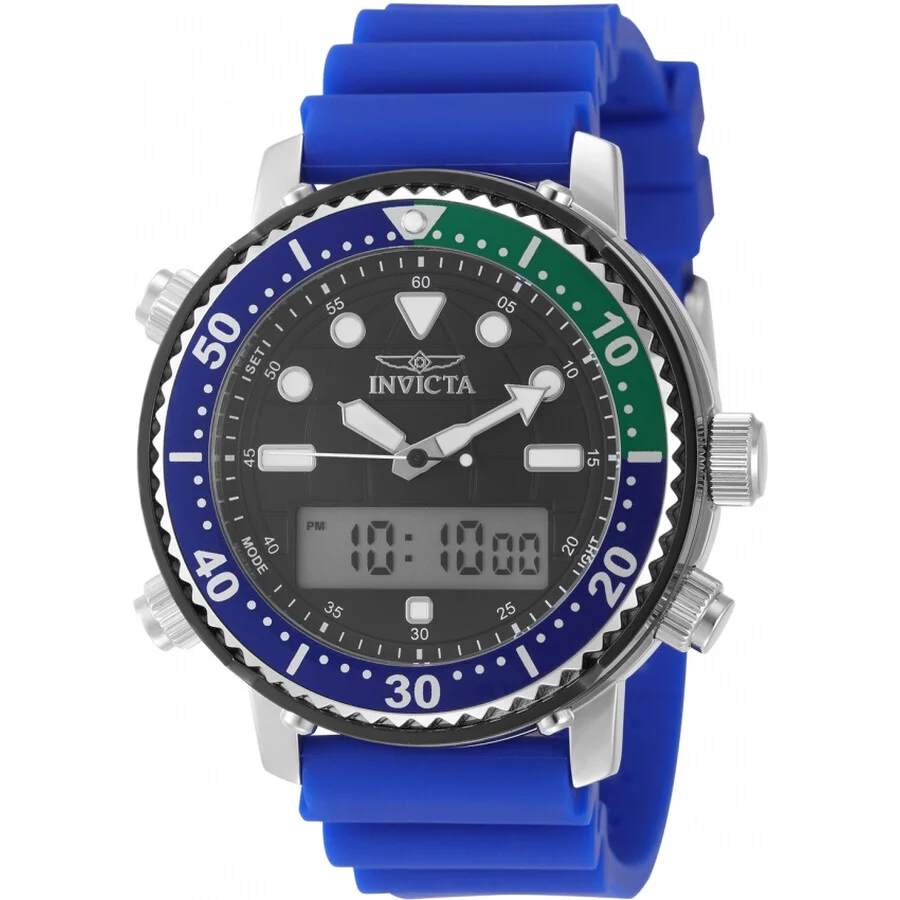 Silver-tone and black stainless steel case with a blue silicone strap. Fixed green and blue luminous and aluminum and stainless steel bezel. Black dial with silver-tone hands and index hour markers. Minute markers around the outer rim. Dial Type: Analog-digital. Luminescent hands and markers. Electronic, PC21AF quartz movement. Scratch resistant mineral crystal. Push, push crown. Solid case back. Round case shape, case size: 46.5 mm, case thickness: 14.70 mm. Band width: 22 mm, band length: 9.25 inches. Buckle clasp. Water resistant at 50 meters / 165 feet. Functions: hour, minute, second. Pro Diver Series. Sport watch style. Watch label: Japan Movt. Invicta Pro Diver Quartz Analog-Digital Black Dial Men's Watch 49447. GENERAL Box Type: Original Box CASE Case Diameter: 46.5 mm Case Thickness: 14.70 mm Case Material: Stainless Steel Case Shape: Round Case Back: Solid BAND Band Material: Silicone Band Type: Strap Band Color: Blue Band Length: 9.25 inches Band Width: 22 mm Clasp: Buckle DIAL Dial Color: Black Type: Analog-Digital Crystal: Scratch Resistant Mineral Hands: Silver-tone Dial Markers: Index Second Markers: Minute Markers around the outer rim Luminiscence: Hands and Markers Bezel: Fixed Bezel Color: Green and Blue Bezel Material: Luminous and Aluminum and Stainless Steel Crown: Push, Push INFORMATION Brand: Invicta Series: Pro Diver Collection Name: Pro Diver Gender: Mens Model: 49447 Watch Label: Japan Movt Movement: Quartz Engine: Electronic, PC21AF FEATURES Water Resistance: 50 meters / 165 feet Functions: Hour, Minute, Second Watch Features: Digital, Analog, Stainless Steel ADDITIONAL INFO Watch Style: Sport Warranty: With Manufacturer's Guarantee UPC Code: 886678664580 Jomashop Sku: IN49447 Department: Watches