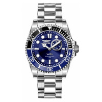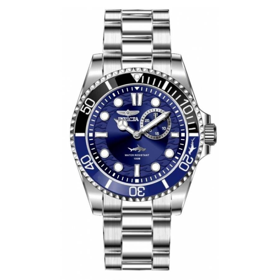 Silver-tone stainless steel case and bracelet. Uni-directional rotating black and blue aluminum bezel. Blue dial with silver-tone hands and index hour markers. Minute markers around the outer rim. Dial Type: Analog. Luminescent hands and markers. One subdial displaying: date. Quartz movement. Scratch resistant mineral crystal. Screw down crown. Solid case back. Round case shape, case size: 43 mm. Band width: 22 mm. Fold over clasp with a safety release. Water resistant at 100 meters / 330 feet. Functions: date, hour, minute. Pro Diver Series. Casual watch style. Invicta Pro Diver Quartz Blue Dial Men's Watch 49278. GENERAL Box Type: Original Box CASE Case Material: Stainless Steel Case Shape: Round Case Back: Solid BAND Band Material: Stainless Steel Band Type: Bracelet Band Color: Silver-tone Band Length: 7.25 inches Band Width: 22 mm Clasp: Fold over safety DIAL Dial Color: Blue Type: Analog Crystal: Scratch Resistant Mineral Hands: Silver-tone Dial Markers: Index Second Markers: Minute Markers around the outer rim Sub Dials: One - Date Luminiscence: Hands and Markers Bezel: Uni-directional Rotating Bezel Color: Multi-tone (Silver-tone and Silver and Blue and Black) Bezel Material: Aluminum and Stainless Steel Crown: Screw Down INFORMATION Brand: Invicta Series: Pro Diver Collection Name: Pro Diver Gender: Mens Model: 49278 Movement: Quartz Engine: VD72 FEATURES Water Resistance: 100 meters / 330 feet Functions: Date, Hour, Minute Watch Features: Stainless Steel, Analog ADDITIONAL INFO Watch Style: Casual Warranty: With Manufacturer's Guarantee UPC Code: 886678662883 Jomashop Sku: IN49278 Department: Watches
