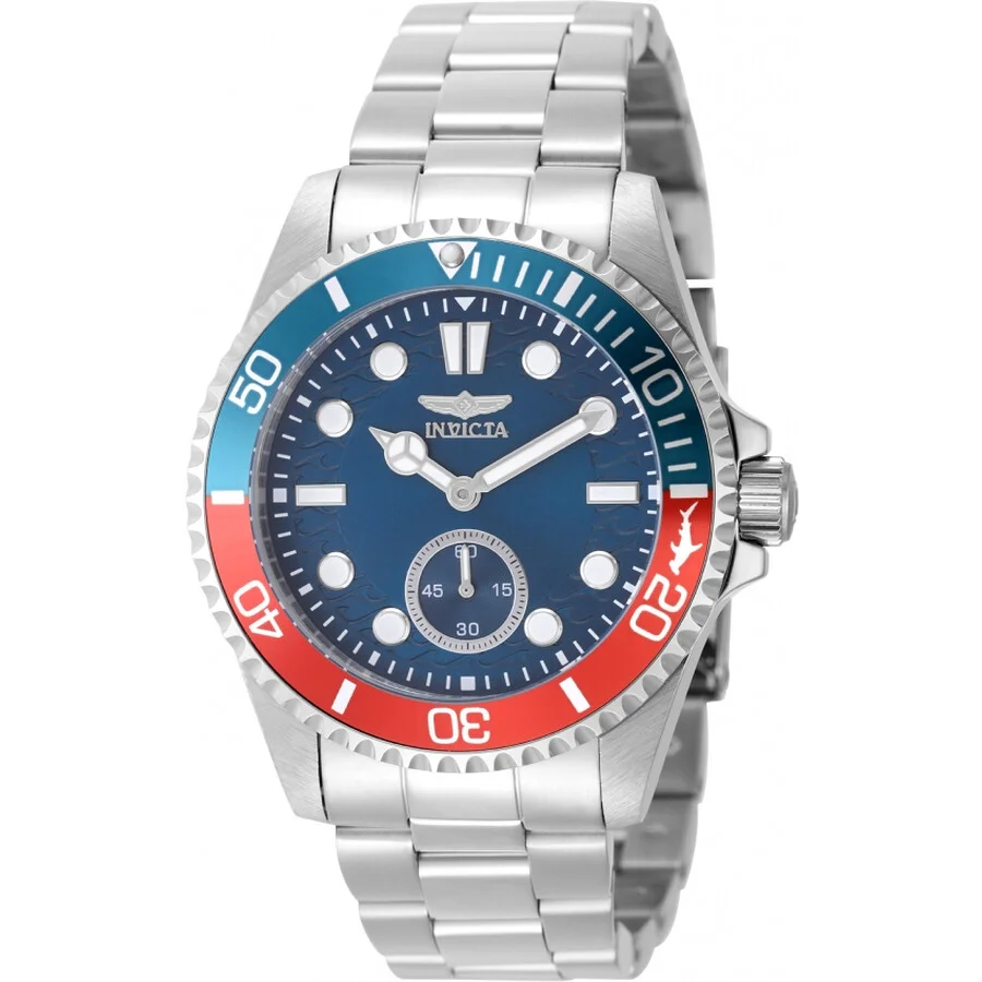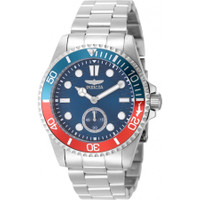 Silver-tone stainless steel case and bracelet. Uni-directional rotating red and blue (pepsi) aluminum and stainless steel bezel. Blue dial with silver-tone Mercedes-logo and Breguet-style shape hands and index hour markers. Minute markers around the outer rim. Dial Type: Analog. Luminescent hands and markers. One subdial displaying: small second. TMI Caliber VD78 quartz movement. Scratch resistant mineral crystal. Screw down crown. Solid case back. Round case shape, case size: 43 mm, case thickness: 11.30 mm. Band width: 22 mm, band length: 7.25 inches. Fold over safety clasp. Water resistant at 100 meters / 330 feet. Functions: hour, minute, small second. Pro Diver Series. Casual watch style. Watch label: Japan Movt. Invicta Pro Diver Quartz Blue Dial Pepsi Bezel Men's Watch 49436. GENERAL Box Type: Original Box CASE Case Diameter: 43 mm Case Thickness: 11.30 mm Case Material: Stainless Steel Case Shape: Round Case Back: Solid BAND Band Material: Stainless Steel Band Type: Bracelet Band Color: Silver-tone Band Length: 7.25 inches Band Width: 22 mm Clasp: Fold over safety DIAL Dial Color: Blue Type: Analog Crystal: Scratch Resistant Mineral Hands: Silver-tone Mercedes-logo and Breguet-style shape Dial Markers: Index Second Markers: Minute Markers around the outer rim Sub Dials: One - Small Second Luminiscence: Hands and Markers Bezel: Uni-directional Rotating Bezel Color: Red and Blue (Pepsi) Bezel Material: Aluminum and Stainless Steel Crown: Screw Down INFORMATION Brand: Invicta Series: Pro Diver Collection Name: Pro Diver Gender: Mens Model: 49436 Watch Label: Japan Movt Movement: Quartz Engine: TMI Caliber VD78 FEATURES Water Resistance: 100 meters / 330 feet Functions: Hour, Minute, Small Second Watch Features: Stainless Steel, Analog ADDITIONAL INFO Watch Style: Casual Warranty: With Manufacturer's Guarantee UPC Code: 886678664474 Jomashop Sku: IN49436 Department: Watches