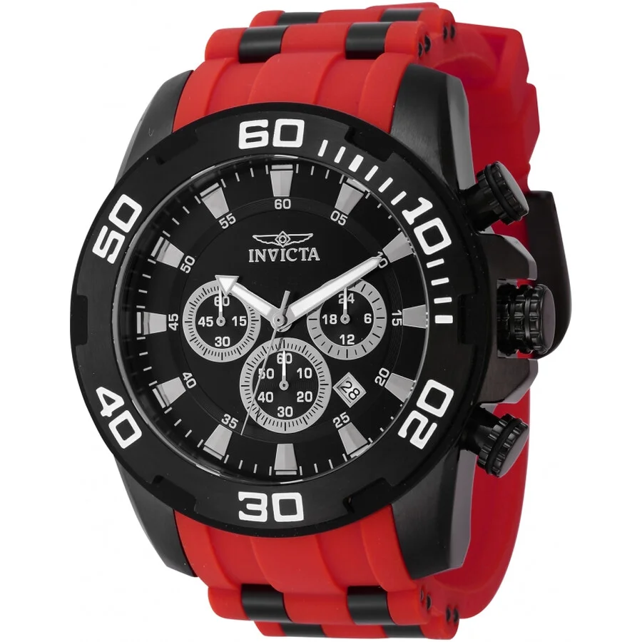 Black stainless steel case with a two-tone (red and black) silicone and stainless steel strap. Fixed black stainless steel bezel. Black dial with silver-tone hands and index hour markers. Minute markers around the outer rim. Dial Type: Analog. Luminescent hands and markers. Date display between 4 and 5 o'clock position. Chronograph - three sub-dials displaying: 60 second, 60 minute and 24 hour. Hattori Caliber VD53 quartz movement. Scratch resistant Flame Fusion crystal. Pull / push crown. Solid case back. Round case shape, case size: 50 mm, case thickness: 14.5 mm. Band width: 26 mm, band length: 8.25 inches. Buckle clasp. Water resistant at 100 meters / 330 feet. Functions: chronograph, date, GMT, second time zone, hour, minute, second. Pro Diver Series. Sport watch style. Watch label: Japan Movt. Invicta Pro Diver SCUBA Chronograph GMT Quartz Black Dial Men's Watch 44546. GENERAL Box Type: Original Box CASE Case Thickness: 14.5 mm Case Material: Stainless Steel Case Shape: Round Case Back: Solid BAND Band Material: Silicone and Stainless Steel Band Type: Strap Band Color: Two-tone (Red and Black) Band Length: 8.25 inches Band Width: 26 mm Clasp: Buckle DIAL Dial Color: Black Type: Analog Crystal: Flame Fusion Hands: Silver-tone Dial Markers: Index Second Markers: Minute Markers around the outer rim Sub Dials: Three - 60 second, 60 minute and 24 hour Luminiscence: Hands and Markers Bezel: Fixed Bezel Color: Black Bezel Material: Stainless Steel Crown: Pull / Push INFORMATION Brand: Invicta Series: Pro Diver Collection Name: Pro Diver Gender: Mens Model: 44546 Watch Label: Japan Movt Movement: Quartz Engine: Hattori Caliber VD53 FEATURES Water Resistance: 100 meters / 330 feet Calendar: Date display between 4 and 5 o'clock position Functions: Chronograph, Date, GMT, Second Time Zone, Hour, Minute, Second Watch Features: Analog, GMT, Stainless Steel, Chronograph, Time Zone ADDITIONAL INFO Watch Style: Sport Warranty: With Manufacturer's Guarantee UPC Code: 886678590858 Jomashop Sku: IN44546 Department: Watches