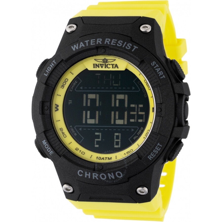 Black plastic case with a yellow polyurethane strap. Fixed black plastic bezel. Black dial. Dial Type: digital. Caliber Electronic quartz movement. Scratch resistant mineral crystal. Solid case back. Round case shape, case size: 52 mm, case thickness: 17.00 mm. Band width: 30 mm, band length: 8 inches. Buckle clasp. Water resistant at 100 meters / 330 feet. Functions: chronograph, GMT, alarm, month, day, date, hour, minute, second. Racing Series. Sport watch style. Invicta Racing Alarm Chronograph GMT Quartz Digital Black Dial Men's Watch 47527. CASE Case Size: 52 Case Thickness: 17.00 mm Case Material: Plastic Case Shape: Round Case Back: Solid BAND Band Material: Polyurethane Band Type: Strap Band Color: Yellow Band Length: 8 inches Band Width: 30 mm Clasp: Buckle DIAL Dial Color: Black Type: Digital Crystal: Scratch Resistant Mineral Bezel: Fixed Bezel Color: Black Bezel Material: Plastic INFORMATION Brand: Invicta Series: Racing Collection Name: Racing Gender: Mens Model: 47527 Movement: Quartz Engine: Caliber Electronic FEATURES Water Resistance: 100 meters / 330 feet Functions: Chronograph, GMT, Alarm, Month, Day, Date, Hour, Minute, Second Watch Features: Digital, GMT, Month, Plastic, Chronograph, Alarm ADDITIONAL INFO Watch Style: Sport Warranty: With Manufacturer's Guarantee UPC Code: 886678630721 Jomashop Sku: IN47527 Department: Watches