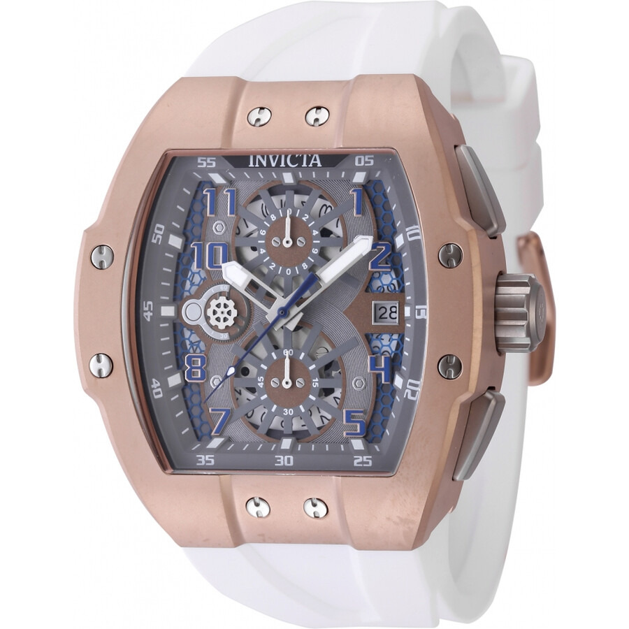 Silver-tone and rose gold stainless steel case with a white silicone strap. Fixed rose gold-tone stainless steel bezel. Grey dial with silver-tone hands and Arabic numeral hour markers. Minute markers around the outer rim. Dial Type: Analog. Luminescent hands and markers. Date display at the 3 o'clock position. Chronograph - three sub-dials displaying: 60 second, 60 minute and 1/10th of a second. Hattori Caliber VD57 quartz movement. Scratch resistant Flame Fusion crystal. Pull / push crown. Solid case back. Tonneau case shape, case size: 47 mm, case thickness: 17 mm. Band width: 28 mm, band length: 8 inches. Buckle clasp. Water resistant at 50 meters / 165 feet. Functions: chronograph, date, hour, minute, second. Racing Series. Sport watch style. Watch label: Japan Movt. Invicta Racing Chronograph Quartz Grey Dial Men's Watch 48028. GENERAL Box Type: Original Box CASE Case Diameter: 47 mm Case Thickness: 17 mm Case Material: Stainless Steel Case Shape: Tonneau Case Back: Solid BAND Band Material: Silicone Band Type: Strap Band Color: White Band Length: 8 inches Band Width: 28 mm Clasp: Buckle DIAL Dial Color: Grey Type: Analog Crystal: Flame Fusion Hands: Silver-tone Dial Markers: Arabic Numeral Second Markers: Minute Markers around the outer rim Sub Dials: Three - 60 Second, 60 Minute and 1/10th of a Second Luminiscence: Hands and Markers Bezel: Fixed Bezel Color: Rose Gold-tone Bezel Material: Stainless Steel Crown: Pull / Push INFORMATION Brand: Invicta Series: Racing Collection Name: Racing Gender: Mens Model: 48028 Watch Label: Japan Movt Movement: Quartz Engine: Hattori Caliber VD57 FEATURES Water Resistance: 50 meters / 165 feet Calendar: Date display at the 3 o'clock position Functions: Chronograph, Date, Hour, Minute, Second Watch Features: Analog, Gold, Stainless Steel, Chronograph ADDITIONAL INFO Watch Style: Sport Warranty: With Manufacturer's Guarantee UPC Code: 886678639946 Jomashop Sku: IN48028 Department: Watches