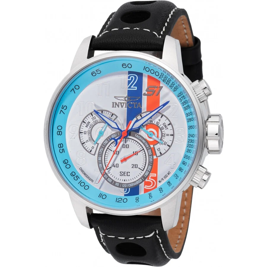 Silver-tone stainless steel case with a multi-tone (white and brown and black and gold) leather strap. Fixed silver-tone stainless steel bezel. Light blue and red and white and blue dial with blue hands and Arabic numeral hour markers. Dial Type: Analog. Luminescent hands and markers. Chronograph - three sub-dials displaying: 60 second, 60 minute and 24 hour. Hattori Caliber VD54 quartz movement. Scratch resistant mineral crystal. Pull / push crown. Solid case back. Round case shape, case size: 48.0 mm, case thickness: 13.5 mm. Band width: 22 mm, band length: 7.75 inches. Buckle clasp. Water resistant at 100 meters / 330 feet. Functions: chronograph, GMT, second time zone, hour, minute, second. S1 Rally Series. Sport watch style. Watch label: Japan Movt. Invicta S1 Rally Chronograph GMT Quartz Men's Watch 48615. GENERAL Box Type: Original Box CASE Case Diameter: 48.0 mm Case Thickness: 13.5 mm Case Material: Stainless Steel Case Shape: Round Case Back: Solid BAND Band Material: Leather Band Type: Strap Band Color: Multi-tone (White and Brown and Black and Gold) Band Length: 7.75 inches Band Width: 22 mm Clasp: Buckle DIAL Dial Color: Light Blue and Red and White and Blue Type: Analog Crystal: Scratch Resistant Mineral Hands: Blue Dial Markers: Arabic Numeral Sub Dials: Three - 60 Second, 60 Minute and 24 Hour Luminiscence: Hands and Markers Bezel: Fixed Bezel Color: Silver-tone Bezel Material: Stainless Steel Crown: Pull / Push INFORMATION Brand: Invicta Series: S1 Rally Collection Name: S1 Rally Gender: Mens Model: 48615 Watch Label: Japan Movt Movement: Quartz Engine: Hattori Caliber VD54 FEATURES Water Resistance: 100 meters / 330 feet Functions: Chronograph, GMT, Second Time Zone, Hour, Minute, Second Watch Features: Analog, GMT, Gold, Leather, Stainless Steel, Chronograph, Time Zone ADDITIONAL INFO Watch Style: Sport Warranty: With Manufacturer's Guarantee UPC Code: 886678650880 Jomashop Sku: IN48615 Department: Watches
