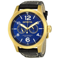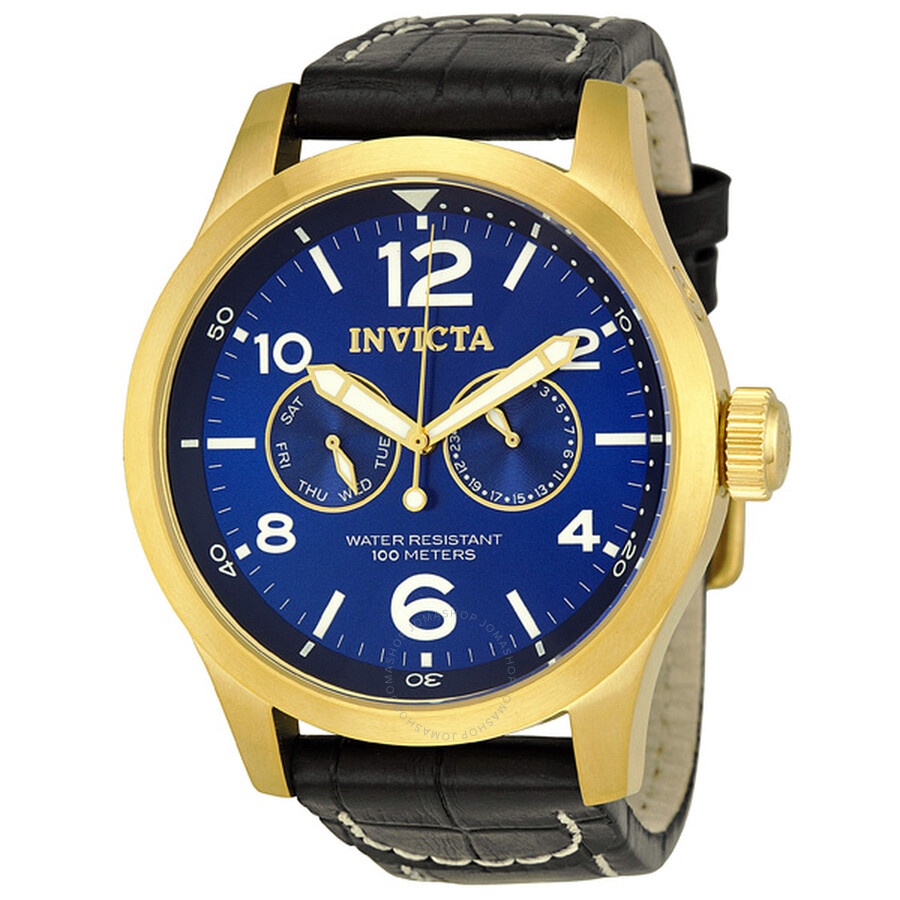 Yellow gold-plated stainless steel case with a black leather strap. Fixed yellow gold-plated bezel. Blue dial with yellow gold-tone hands and alternating Arabic numeral and index hour markers. Minute markers. Arabic Numeral Minute Markers (at 10 minute intervals) around the outer rim. Dial Type: Analog. Luminescent hands and markers. Two multi-function sub-dials displaying: day of the week and date. ISA caliber 9231/1890 quartz movement. Scratch resistant flame fusion crystal. Pull / push crown. Solid case back. Case size: 48 mm. Case thickness: 13 mm. Round case shape. Band width: 24 mm. Band length: 10 inches. Tang clasp. Water resistant at 100 meters / 330 feet. Functions: date, day, hour, minute, second. Casual watch style. Invicta Specialty Military Multi-Function Men's Watch 12173. GENERAL Box Type: Original Box Color: Black / Blue / Gold CASE Case Diameter: 48 Case Thickness: 13 mm Case Material: Stainless Steel Case Shape: Round Case Back: Solid BAND Band Material: Leather Band Type: Strap Band Color: Black Band Length: 10 inches Band Width: 24 mm Clasp: Tang DIAL Dial Color: Blue Type: Analog Crystal: Flame Fusion Hands: Yellow Gold-tone Dial Markers: Arabic Numeral and Index Second Markers: Minute Markers around the outer rim Sub Dials: Two - Day of the Week and Date Luminiscence: Hands and Markers Bezel: Fixed Bezel Color: Yellow Gold-plated Bezel Material: Stainless Steel Crown: Pull / Push INFORMATION Brand: Invicta Series: Specialty Military Collection Name: Specialty Military Gender: Mens Model: 12173 Movement: Quartz Engine: ISA Caliber 9231/1890 FEATURES Water Resistance: 100 meters / 330 feet Functions: Date, Day, Hour, Minute, Second Watch Features: Analog, Gold, Leather, Stainless Steel ADDITIONAL INFO Watch Style: Casual Warranty: With Manufacturers Guarantee UPC Code: 886678121731 Jomashop Sku: IN12173 Department: Watches Category: Watches