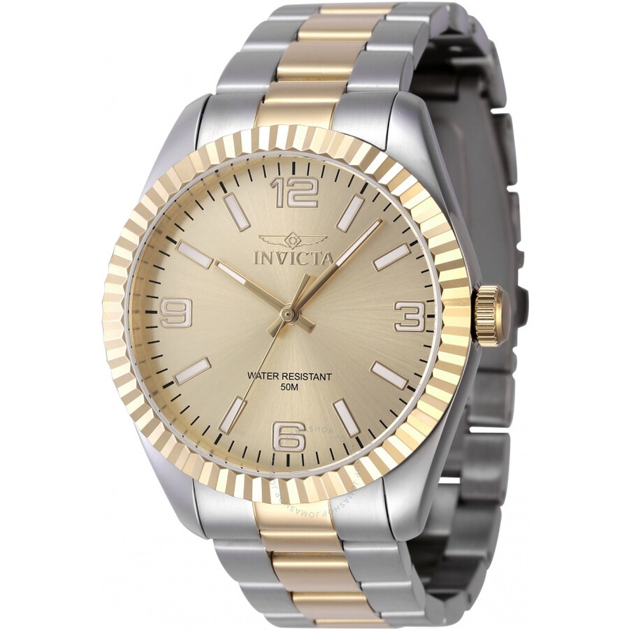 Silver-tone stainless steel case with a two-tone (gold and silver-tone) stainless steel bracelet. Fixed fluted gold-tone stainless steel bezel. Gold-tone dial with gold-tone hands and index-Arabic numeral hour markers. Minute markers around the outer rim. Dial Type: Analog. Luminescent hands and markers. Hattori Caliber PC21 quartz movement. Scratch resistant mineral crystal. Pull / push crown. Solid case back. Round case shape, case size: 43 mm, case thickness: 10.50 mm. Band width: 22 mm, band length: 7 inches. Fold over push button clasp. Water resistant at 50 meters / 165 feet. Functions: hour, minute, second. Specialty Series. Casual watch style. Watch label: Japan Movt. Invicta Specialty Quartz Gold Dial Men's Watch 47457. CASE Case Size: 43 Case Thickness: 10.50 mm Case Material: Stainless Steel Case Shape: Round Case Back: Solid BAND Band Material: Stainless Steel Band Type: Bracelet Band Color: Two-tone (Gold and Silver-tone) Band Length: 7 inches Band Width: 22 mm Clasp: Fold over push button DIAL Dial Color: Gold-tone Type: Analog Crystal: Scratch Resistant Mineral Hands: Gold-tone Dial Markers: Index-Arabic Numeral Second Markers: Minute Markers around the outer rim Luminiscence: Hands and Markers Bezel: Fixed Fluted Bezel Color: Gold-tone Bezel Material: Stainless Steel Crown: Pull / Push INFORMATION Brand: Invicta Series: Specialty Collection Name: Specialty Gender: Mens Model: 47457 Watch Label: Japan Movt Movement: Quartz Engine: Hattori Caliber PC21 FEATURES Water Resistance: 50 meters / 165 feet Functions: Hour, Minute, Second Watch Features: Stainless Steel, Gold, Analog ADDITIONAL INFO Watch Style: Casual Warranty: With Manufacturer's Guarantee UPC Code: 886678629527 Jomashop Sku: IN47457 Department: Watches