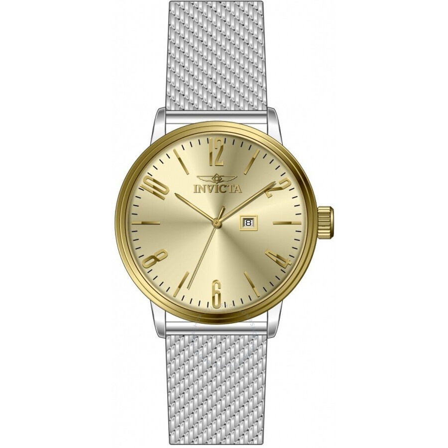 Silver-tone and gold stainless steel case with a silver-tone stainless steel mesh bracelet. Fixed gold-tone stainless steel bezel. Gold-tone dial with gold-tone hands and index-Arabic numeral hour markers. Dial Type: Analog. Date display at the 3 o'clock position. TMI Caliber PC22A quartz movement. Scratch resistant mineral crystal. Pull / push crown. Solid case back. Round case shape, case size: 44 mm, case thickness: 10.50 mm. Band width: 22 mm, band length: 8 inches. Buckle clasp. Water resistant at 50 meters / 165 feet. Functions: date, hour, minute, second. Specialty Series. Casual watch style. Watch label: Japan Movt. Invicta Specialty Quartz Gold Dial Men's Watch 48937. GENERAL Box Type: Original Box CASE Case Thickness: 10.50 mm Case Material: Stainless Steel Case Shape: Round Case Back: Solid BAND Band Material: Stainless Steel Mesh Band Type: Bracelet Band Color: Silver-tone Band Length: 8 inches Band Width: 22 mm Clasp: Buckle DIAL Dial Color: Gold-tone Type: Analog Crystal: Scratch Resistant Mineral Hands: Gold-tone Dial Markers: Index-Arabic Numeral Bezel: Fixed Bezel Color: Gold-tone Bezel Material: Stainless Steel Crown: Pull / Push INFORMATION Brand: Invicta Series: Specialty Collection Name: Specialty Gender: Mens Model: 48937 Watch Label: Japan Movt Movement: Quartz Engine: TMI Caliber PC22A FEATURES Water Resistance: 50 meters / 165 feet Calendar: Date display at the 3 o'clock position Functions: Date, Hour, Minute, Second Watch Features: Analog, Gold, Stainless Steel ADDITIONAL INFO Watch Style: Casual Warranty: With Manufacturer's Guarantee UPC Code: 886678656738 Jomashop Sku: IN48937 Department: Watches
