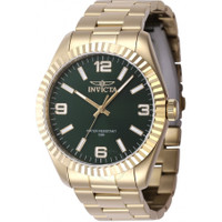 Gold-tone stainless steel case and bracelet. Fixed gold-tone stainless steel bezel. Green dial with gold-tone hands and index-Arabic numeral hour markers. Minute markers around the outer rim. Dial Type: Analog. Luminescent hands and markers. Hattori Caliber PC21 quartz movement. Scratch resistant mineral crystal. Pull / push crown. Solid case back. Round case shape, case size: 43 mm, case thickness: 10.50 mm. Band width: 22 mm, band length: 7 inches. Fold over push button clasp. Water resistant at 50 meters / 165 feet. Functions: hour, minute, second. Specialty Series. Casual watch style. Watch label: Japan Movt. Invicta Specialty Quartz Green Dial Men's Watch 47459. CASE Case Diameter: 43 Case Thickness: 10.50 mm Case Material: Stainless Steel Case Shape: Round Case Back: Solid BAND Band Material: Stainless Steel Band Type: Bracelet Band Color: Gold-tone Band Length: 7 inches Band Width: 22 mm Clasp: Fold over push button DIAL Dial Color: Green Type: Analog Crystal: Scratch Resistant Mineral Hands: Gold-tone Dial Markers: Index-Arabic Numeral Second Markers: Minute Markers around the outer rim Luminiscence: Hands and Markers Bezel: Fixed Bezel Color: Gold-tone Bezel Material: Stainless Steel Crown: Pull / Push INFORMATION Brand: Invicta Series: Specialty Collection Name: Specialty Gender: Mens Model: 47459 Watch Label: Japan Movt Movement: Quartz Engine: Hattori Caliber PC21 FEATURES Water Resistance: 50 meters / 165 feet Functions: Hour, Minute, Second Watch Features: Stainless Steel, Gold, Analog ADDITIONAL INFO Watch Style: Casual Warranty: With Manufacturer's Guarantee UPC Code: 886678629541 Jomashop Sku: IN47459 Department: Watches