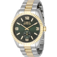 Silver-tone stainless steel case with a two-tone (gold and silver-tone) stainless steel bracelet. Fixed gold-tone stainless steel bezel. Green dial with gold-tone hands and index-Arabic numeral hour markers. Minute markers around the outer rim. Dial Type: Analog. One subdial displaying: small second. TMI Caliber VD78 quartz movement. Scratch resistant mineral crystal. Pull / push crown. Solid case back. Round case shape, case size: 43 mm. Band width: 22 mm, band length: 7 inches. Fold over clasp with a safety release. Water resistant at 50 meters / 165 feet. Functions: hour, minute, small second. Specialty Series. Dress watch style. Watch label: Japan Movt. Invicta Specialty Quartz Green Dial Men's Watch 49386. GENERAL Box Type: Original Box CASE Case Material: Stainless Steel Case Shape: Round Case Back: Solid BAND Band Material: Stainless Steel Band Type: Bracelet Band Color: Two-tone (Gold and Silver-tone) Band Length: 7 inches Band Width: 22 mm Clasp: Fold Over with Safety Release DIAL Dial Color: Green Type: Analog Crystal: Scratch Resistant Mineral Hands: Gold-tone Dial Markers: Index-Arabic Numeral Second Markers: Minute Markers around the outer rim Sub Dials: One - Small Second Bezel: Fixed Bezel Color: Gold-tone Bezel Material: Stainless Steel Crown: Pull / Push INFORMATION Brand: Invicta Series: Specialty Collection Name: Specialty Gender: Mens Model: 49386 Watch Label: Japan Movt Movement: Quartz Engine: TMI Caliber VD78 FEATURES Water Resistance: 50 meters / 165 feet Functions: Hour, Minute, Small Second Watch Features: Analog, Gold, Stainless Steel ADDITIONAL INFO Watch Style: Dress Warranty: With Manufacturer's Guarantee UPC Code: 886678663972 Jomashop Sku: IN49386 Department: Watches