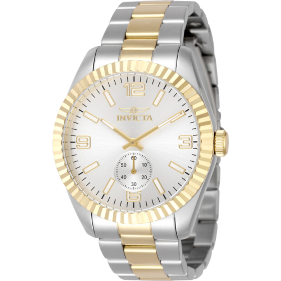 Silver-tone stainless steel case with a two-tone (gold and silver-tone) stainless steel bracelet. Fixed gold-tone stainless steel bezel. Silver-tone dial with gold-tone hands and index-Arabic numeral hour markers. Minute markers around the outer rim. Dial Type: Analog. One subdial displaying: small second. TMI Caliber VD78 quartz movement. Scratch resistant mineral crystal. Pull / push crown. Solid case back. Round case shape, case size: 43 mm. Band width: 22 mm, band length: 7 inches. Fold over clasp with a safety release. Water resistant at 50 meters / 165 feet. Functions: hour, minute, small second. Specialty Series. Dress watch style. Watch label: Japan Movt. Invicta Specialty Quartz Silver Dial Men's Watch 49385. GENERAL Box Type: Original Box CASE Case Material: Stainless Steel Case Shape: Round Case Back: Solid BAND Band Material: Stainless Steel Band Type: Bracelet Band Color: Two-tone (Gold and Silver-tone) Band Length: 7 inches Band Width: 22 mm Clasp: Fold Over with Safety Release DIAL Dial Color: Silver-tone Type: Analog Crystal: Scratch Resistant Mineral Hands: Gold-tone Dial Markers: Index-Arabic Numeral Second Markers: Minute Markers around the outer rim Sub Dials: One - Small Second Bezel: Fixed Bezel Color: Gold-tone Bezel Material: Stainless Steel Crown: Pull / Push INFORMATION Brand: Invicta Series: Specialty Collection Name: Specialty Gender: Mens Model: 49385 Watch Label: Japan Movt Movement: Quartz Engine: TMI Caliber VD78 FEATURES Water Resistance: 50 meters / 165 feet Functions: Hour, Minute, Small Second Watch Features: Analog, Gold, Stainless Steel ADDITIONAL INFO Watch Style: Dress Warranty: With Manufacturer's Guarantee UPC Code: 886678663965 Jomashop Sku: IN49385 Department: Watches