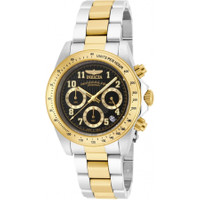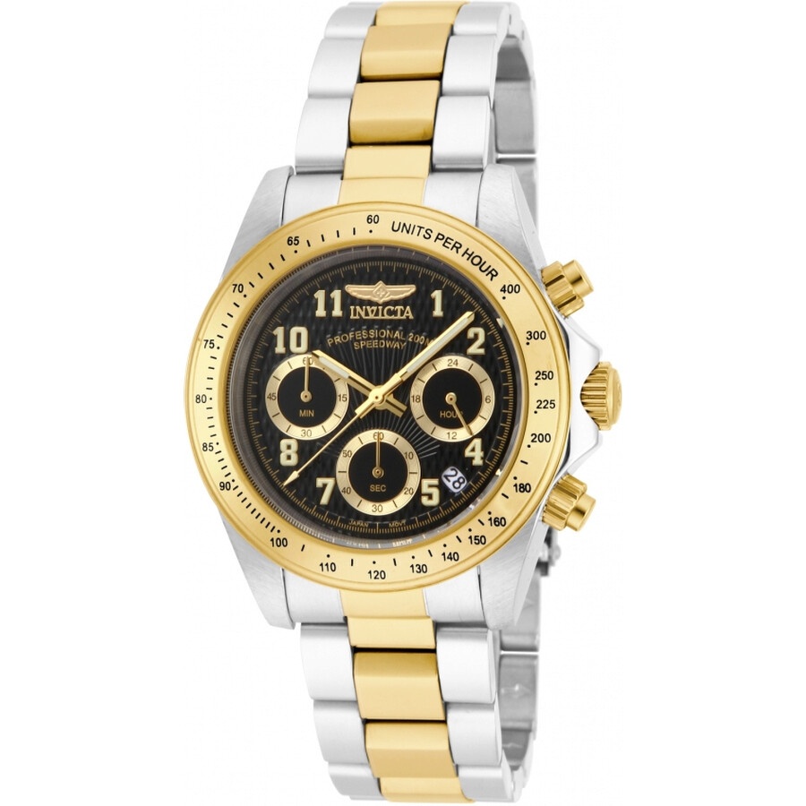 Stainless steel case with a two-tone (silver-tone and yellow gold-plated) stainless steel bracelet. Fixed yellow gold-tone bezel showing tachymeter markers. Black dial with luminous yellow gold-tone hands and Arabic numeral hour markers. Minute markers around the outer rim. Dial Type: Analog. Luminescent hands and markers. Date display between the 4 and 5 o'clock positions. Chronograph - three sub-dials displaying: 60 second, 60 minute and 24 hour. TMI caliber VD53B-14 quartz movement. Scratch resistant mineral crystal. Screw down crown. Solid case back. Round case shape. Case size: 39.5 mm. Case thickness: 13 mm. Band width: 20 mm. Band length: 8.25 inches. Fold over clasp with a safety release. Water resistant at 200 meters / 660 feet. Functions: chronograph, date, hour, minute, second, tachymeter. Additional Info: suitable for recreational scuba diving. Speedway Series. Sport watch style. Watch label: Japan Movt. Invicta Speedway Chronograph Black Dial Men's Watch 17027. INFORMATION Brand: Invicta Series: Speedway Collection Name: Speedway Gender: Mens Model: 17027 Watch Label: Japan Movt Movement: Quartz Engine: TMI Caliber VD53B-14 CASE Case Size: 39.5 mm Case Thickness: 13 mm Case Material: Stainless Steel Case Shape: Round Case Back: Solid BAND Band Material: Stainless Steel Band Type: Bracelet Band Color: Two-tone (Silver-tone and Yellow Gold-plated) Band Length: 8.25 inches Band Width: 20 mm Clasp: Fold Over with Safety Release DIAL Dial Color: Black Type: Analog Crystal: Scratch Resistant Mineral Hands: Luminous Yellow Gold-tone Dial Markers: Arabic Numeral Second Markers: Minute Markers around the outer rim Sub Dials: Three - 60 Second, 60 Minute and 24 Hour Luminiscence: Hands and Markers Bezel: Fixed Bezel Color: Yellow Gold-tone Bezel Material: Stainless Steel showing Tachymeter Markers Crown: Screw Down FEATURES Water Resistance: 200 meters / 660 feet Calendar: Date display between the 4 and 5 o'clock positions Functions: Chronograph, Date, Hour, Minute, Second, Tachymeter Watch Features: Chronograph, Stainless Steel, Gold, Analog ADDITIONAL INFO Watch Style: Sport Warranty: With Manufacturers Guarantee UPC Code: 886678208425 Additional Info: suitable for recreational scuba diving Jomashop Sku: IN17027 Department: Watches Category: Watches