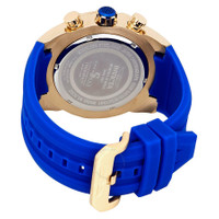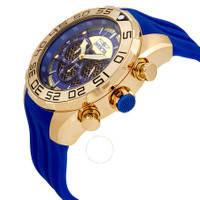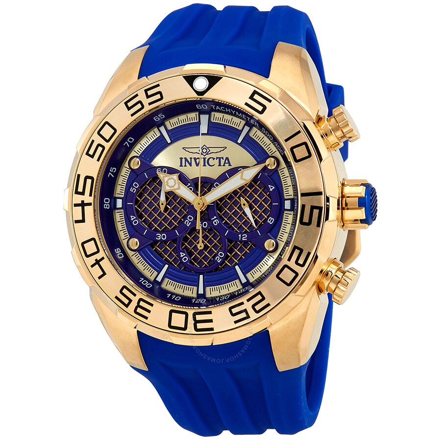 Yellow gold-plated stainless steel case with a blue silicone strap. Uni-directional rotating yellow gold-plated bezel with a gold aluminium top ring. Blue dial with luminous yellow gold-tone hands and index hour markers. Minute markers. Tachymeter markings around the outer rim. Dial Type: Analog. Luminescent hands and markers. Chronograph - three sub-dials displaying: 60 second, 60 minute and 24 hour. Hattori caliber VD54 quartz movement. Scratch resistant flame fusion crystal. Pull / push crown. Solid case back. Round case shape. Case size: 50 mm. Case thickness: 18 mm. Band width: 32 mm. Band length: 8 inches. Tang clasp. Water resistant at 100 meters / 330 feet. Functions: chronograph, tachymeter, GMT, second time zone, hour, minute, second. Additional Info: in general, suitable for swimming and snorkeling, but not diving. Sport watch style. Watch label: Japan Movt. Invicta Speedway Chronograph Blue Dial Blue Silicone Men's Watch 26302. INFORMATION Brand: Invicta Series: Speedway Collection Name: Speedway Gender: Mens Model: 26302 Watch Label: Japan Movt Movement: Quartz Engine: Hattori Caliber VD54 CASE Case Size: 50 mm Case Thickness: 18 mm Case Material: Stainless Steel Case Shape: Round Case Back: Solid BAND Band Material: Silicone Band Type: Strap Band Color: Blue Band Length: 8 inches Band Width: 32 mm Clasp: Tang DIAL Dial Color: Blue Type: Analog Crystal: Flame Fusion Hands: Luminous Yellow Gold-tone Dial Markers: Index Second Markers: Minute Markers. Tachymeter Markings around the outer rim Sub Dials: Three - 60 Second, 60 Minute and 24 Hour Luminiscence: Hands and Markers Bezel: Uni-directional Rotating Bezel Color: Yellow Gold-plated Bezel Material: Stainless Steel with a Gold Aluminium Top Ring Crown: Pull / Push FEATURES Water Resistance: 100 meters / 330 feet Functions: Chronograph, Tachymeter, GMT, Second Time Zone, Hour, Minute, Second Watch Features: Analog, GMT, Gold, Stainless Steel, Chronograph, Time Zone ADDITIONAL INFO Watch Style: Sport Warranty: With Manufacturer's Guarantee UPC Code: 886678316960 Additional Info: in general, suitable for swimming and snorkeling, but not diving Jomashop Sku: IN26302 Department: Watches Category: Watches