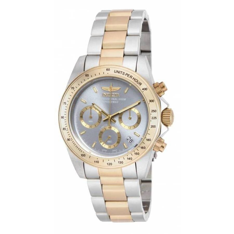 Gold-tone stainless steel case and bracelet. Fixed gold-tone stainless steel bezel. Grey dial with gold-tone hands and index hour markers. Minute markers around the outer rim. Dial Type: Analog. Luminescent hands and markers. Date display between 4 and 5 o'clock position. Chronograph - three sub-dials displaying: 60 second, 60 minute and 24 hour. TMI Caliber VD53B-14 quartz movement. Scratch resistant mineral crystal. Screw down crown. Solid case back. Round case shape, case size: 39.5 mm, case thickness: 14 mm. Band width: 20 mm, band length: 8.5 inches. Fold over clasp. Water resistant at 200 meters / 660 feet. Functions: chronograph, date, GMT, second time zone, hour, minute, second. Speedway Series. Casual watch style. Watch label: Japan Movt. Invicta Speedway Chronograph GMT Quartz Grey Dial Men's Watch ILE9212A. GENERAL Box Type: Original Box CASE Case Diameter: 39.5 mm Case Thickness: 14 mm Case Material: Stainless Steel Case Shape: Round Case Back: Solid BAND Band Material: Stainless Steel Band Type: Bracelet Band Color: Gold-tone Band Length: 8.5 inches Band Width: 20 mm Clasp: Fold Over DIAL Dial Color: Grey Type: Analog Crystal: Mineral Hands: Gold-tone Dial Markers: Index Second Markers: Minute Markers around the outer rim Sub Dials: Three - 60 Second, 60 Minute and 24 Hour Luminiscence: Hands and Markers Bezel: Fixed Bezel Color: Gold-tone Bezel Material: Stainless Steel Crown: Screw Down INFORMATION Brand: Invicta Series: Speedway Collection Name: Speedway Gender: Mens Model: ILE9212A Watch Label: Japan Movt Movement: Quartz Engine: TMI Caliber VD53B-14 FEATURES Water Resistance: 200 meters / 660 feet Calendar: Date display between 4 and 5 o'clock position Functions: Chronograph, Date, GMT, Second Time Zone, Hour, Minute, Second Watch Features: Analog, GMT, Gold, Stainless Steel, Chronograph, Time Zone ADDITIONAL INFO Watch Style: Casual Warranty: With Manufacturer's Guarantee UPC Code: 886678207015 Jomashop Sku: INILE9212A Department: Watches Category: Watches