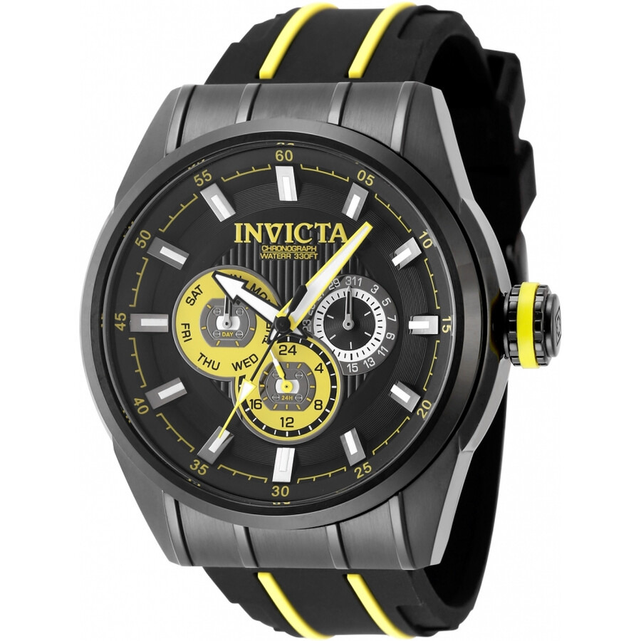 Black stainless steel case with a two-tone (yellow and black) silicone strap. Fixed black stainless steel bezel. Black dial with black hands and index hour markers. Minute markers around the outer rim. Dial Type: Analog. Luminescent hands and markers. Date display at the 3 o'clock position. Three sub-dials displaying: date, day and 24 hour. TMI Caliber VH63 quartz movement. Scratch resistant mineral crystal. Pull / push crown. Solid case back. Round case shape, case size: 48 mm, case thickness: 15.20 mm. Band width: 24 mm, band length: 8.50 inches. Buckle clasp. Water resistant at 100 meters / 330 feet. Functions: date, day, second time zone, hour, minute, second. Speedway Series. Casual watch style. Watch label: Japan Movt. Invicta Speedway Quartz Black Dial Men's Watch 49052. GENERAL Box Type: Original Box CASE Case Thickness: 15.20 mm Case Material: Stainless Steel Case Shape: Round Case Back: Solid BAND Band Material: Silicone Band Type: Strap Band Color: Two-tone (Yellow and Black) Band Length: 8.50 inches Band Width: 24 mm Clasp: Buckle DIAL Dial Color: Black Type: Analog Crystal: Scratch Resistant Mineral Hands: Black Dial Markers: Index Second Markers: Minute Markers around the outer rim Sub Dials: Three - Date, Day and 24 Hour Luminiscence: Hands and Markers Bezel: Fixed Bezel Color: Black Bezel Material: Stainless Steel Crown: Pull / Push INFORMATION Brand: Invicta Series: Speedway Collection Name: Speedway Gender: Mens Model: 49052 Watch Label: Japan Movt Movement: Quartz Engine: TMI Caliber VH63 FEATURES Water Resistance: 100 meters / 330 feet Calendar: Date display at the 3 o'clock position Functions: Date, Day, Second Time Zone, Hour, Minute, Second Watch Features: Analog, Stainless Steel, Time Zone ADDITIONAL INFO Watch Style: Casual Warranty: With Manufacturer's Guarantee UPC Code: 886678659593 Jomashop Sku: IN49052 Department: Watches