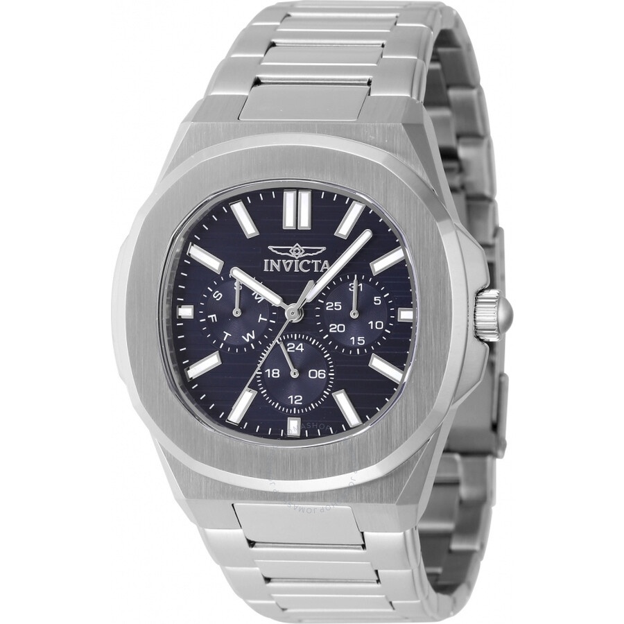 Silver-tone stainless steel case and bracelet. Fixed silver-tone stainless steel bezel. Blue dial with silver-tone hands and index hour markers. Minute markers around the outer rim. Dial Type: Analog. Luminescent hands and markers. Date display at the 3 o'clock position. Three sub-dials displaying: date, day and 24 hour. TMI Caliber VH63 quartz movement. Scratch resistant mineral crystal. Pull / push crown. Solid case back. Oval case shape, case size: 41 mm, case thickness: 12.1 mm. Band width: 26 mm, band length: 7.25 inches. Fold over safety clasp. Water resistant at 50 meters / 165 feet. Functions: date, day, second time zone, hour, minute, second. Speedway Series. Casual watch style. Watch label: Japan Movt. Invicta Speedway Quartz Blue Dial Men's Watch 48326. GENERAL Box Type: Original Box CASE Case Thickness: 12.1 mm Case Material: Stainless Steel Case Shape: Oval Case Back: Solid BAND Band Material: Stainless Steel Band Type: Bracelet Band Color: Silver-tone Band Length: 7.25 inches Band Width: 26 mm Clasp: Fold over safety DIAL Dial Color: Blue Type: Analog Crystal: Scratch Resistant Mineral Hands: Silver-tone Dial Markers: Index Second Markers: Minute Markers around the outer rim Sub Dials: Three - Date, Day and 24 Hour Luminiscence: Hands and Markers Bezel: Fixed Bezel Color: Silver-tone Bezel Material: Stainless Steel Crown: Pull / Push INFORMATION Brand: Invicta Series: Speedway Collection Name: Speedway Gender: Mens Model: 48326 Watch Label: Japan Movt Movement: Quartz Engine: TMI Caliber VH63 FEATURES Water Resistance: 50 meters / 165 feet Calendar: Date display at the 3 o'clock position Functions: Date, Day, Second Time Zone, Hour, Minute, Second Watch Features: Analog, Stainless Steel, Time Zone ADDITIONAL INFO Watch Style: Casual Warranty: With Manufacturer's Guarantee UPC Code: 886678644100 Jomashop Sku: IN48326 Department: Watches