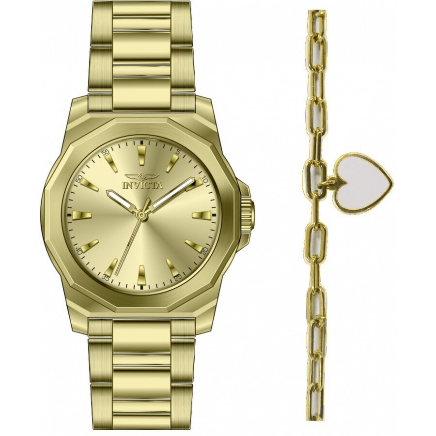 Gold-tone stainless steel case and bracelet. Fixed gold-tone stainless steel bezel. Gold-tone dial with gold-tone hands and index hour markers. Minute markers around the outer rim. Dial Type: Analog. Luminescent hands. TMI Caliber PC21J quartz movement. Scratch resistant mineral crystal. Pull / push crown. Solid case back. Tonneau case shape, case size: 34 mm, case thickness: 9.20 mm. Band width: 18 mm, band length: 6.75 inches. Fold over push button clasp. Water resistant at 30 meters / 100 feet. Functions: hour, minute, second. Speedway Series. Casual watch style. Watch label: Japan Movt. Invicta Speedway Quartz Gold Dial Ladies Watch 48579. GENERAL Box Type: Original Box CASE Case Diameter: 34 mm Case Thickness: 9.20 mm Case Material: Stainless Steel Case Shape: Tonneau Case Back: Solid BAND Band Material: Stainless Steel Band Type: Bracelet Band Color: Gold-tone Band Length: 6.75 inches Band Width: 18 mm Clasp: Fold over push button DIAL Dial Color: Gold-tone Type: Analog Crystal: Scratch Resistant Mineral Hands: Gold-tone Dial Markers: Index Second Markers: Minute Markers around the outer rim Luminiscence: Hands Bezel: Fixed Bezel Color: Gold-tone Bezel Material: Stainless Steel Crown: Pull / Push INFORMATION Brand: Invicta Series: Speedway Collection Name: Speedway Gender: Womens Model: 48579 Watch Label: Japan Movt Movement: Quartz Engine: TMI Caliber PC21J FEATURES Water Resistance: 30 meters / 100 feet Functions: Hour, Minute, Second Watch Features: Analog, Gold, Stainless Steel ADDITIONAL INFO Watch Style: Casual Warranty: With Manufacturer's Guarantee UPC Code: 886678650231 Jomashop Sku: IN48579 Department: Watches