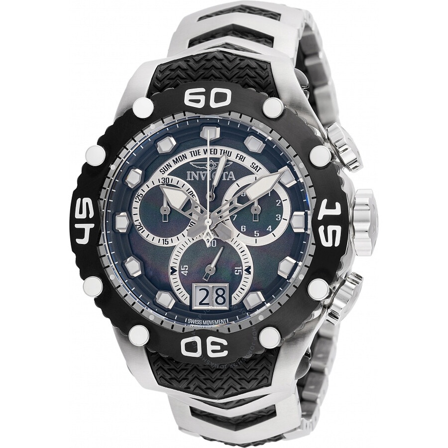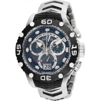 Silver-tone and black stainless steel case with a two-tone (black and silver-tone) stainless steel bracelet. Uni-directional rotating two-tone (silver-tone and black) stainless steel bezel. Silver and black dial with silver-tone hands and index hour markers. Minute markers around the outer rim. Dial Type: Analog. Luminescent hands and markers. Date display at the 6 o'clock position. Four sub-dials displaying: 60 second, 30 minute and 1/10th of a second and retrograde day. Ronda Caliber 8040.N quartz movement. Scratch resistant Flame Fusion crystal. Screw down crown. Solid case back. Round case shape, case size: 48.50 mm, case thickness: 18.30 mm. Band width: 36.05 mm, band length: 8.25 inches. Fold over safety clasp. Water resistant at 200 meters / 660 feet. Functions: chronograph, retrograde, big date, day, hour, minute, small second. Subaqua Series. Sport watch style. Watch label: Swiss Movt. Invicta Subaqua Noma VIII Chronograph Quartz Men's Watch 47291. GENERAL Box Type: Original Box CASE Case Diameter: 48 Case Thickness: 18.30 mm Case Material: Stainless Steel Case Shape: Round Case Back: Solid BAND Band Material: Stainless Steel Band Type: Bracelet Band Color: Two-tone (Black and Silver-tone) Band Length: 8.25 inches Band Width: 36.05 mm Clasp: Fold over safety DIAL Dial Color: Silver and Black Type: Analog Crystal: Flame Fusion Hands: Silver-tone Dial Markers: Index Second Markers: Minute Markers around the outer rim Sub Dials: Four - 60 Second, 30 Minute and 1/10th of a Second and Retrograde Day Luminiscence: Hands and Markers Bezel: Uni-directional Rotating Bezel Color: Two-tone (Silver-tone and Black) Bezel Material: Stainless Steel Crown: Screw Down INFORMATION Brand: Invicta Series: Subaqua Collection Name: Subaqua Gender: Mens Model: 47291 Watch Label: Swiss Movt Movement: Quartz Engine: Ronda Caliber 8040.N FEATURES Water Resistance: 200 meters / 660 feet Calendar: Date display at the 6 o'clock position Functions: Chronograph, Retrograde, Big Date, Day, Hour, Minute, Small Second Watch Features: Analog, Retrograde, Stainless Steel, Chronograph ADDITIONAL INFO Watch Style: Sport Warranty: With Manufacturer's Guarantee UPC Code: 886678627233 Jomashop Sku: IN47291 Department: Watches