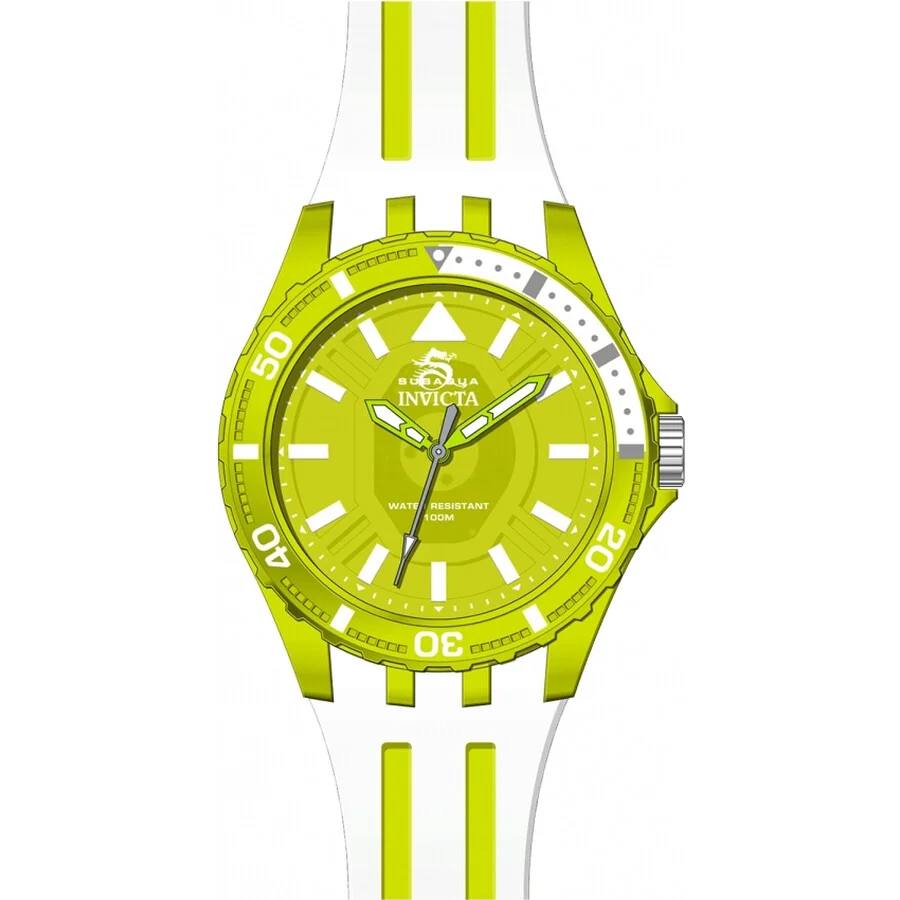 Green acrylic case with a green silicone strap. Fixed green acrylic bezel. Green dial with green hands and index hour markers. Minute markers around the outer rim. Dial Type: Analog. Luminescent hands and markers. Hattori Caliber PC21S quartz movement. Scratch resistant Flame Fusion crystal. Pull / push crown. Solid case back. Round case shape, case size: 44 mm. Band width: 26 mm, band length: 7.75 inches. Buckle clasp. Water resistant at 100 meters / 330 feet. Functions: hour, minute, second. Subaqua Series. Casual watch style. Watch label: Japan Movt. Invicta Subaqua Quartz Green Dial Men's Watch 69451. GENERAL Box Type: Original Box CASE Case Material: Acrylic Case Shape: Round Case Back: Solid BAND Band Material: Silicone Band Type: Strap Band Color: Green Band Length: 7.75 inches Band Width: 26 mm Clasp: Buckle DIAL Dial Color: Green Type: Analog Crystal: Flame Fusion Hands: Green Dial Markers: Index Second Markers: Minute Markers around the outer rim Luminiscence: Hands and Markers Bezel: Fixed Bezel Color: Green Bezel Material: Acrylic Crown: Pull / Push INFORMATION Brand: Invicta Series: Subaqua Collection Name: Subaqua Gender: Mens Model: 69451 Watch Label: Japan Movt Movement: Quartz Engine: Hattori Caliber PC21S FEATURES Water Resistance: 100 meters / 330 feet Functions: Hour, Minute, Second Watch Features: Analog ADDITIONAL INFO Watch Style: Casual Warranty: With Manufacturer's Guarantee UPC Code: 886678678648 Jomashop Sku: IN69451 Department: Watches